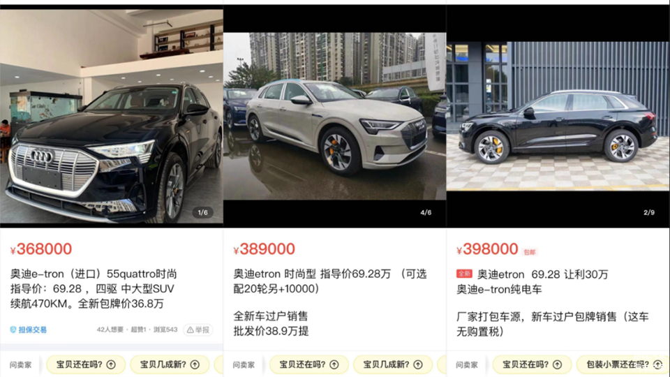 再次以奥迪为例,不久前刚刚完成了对奥迪e-tronGT的22.1万元官降,旗舰车型为了刺激销量进行官降,高预算用户对此的认知为“还会继续降”。2021年上市的奥迪e-tron系列同样如此,上市时续航里程500公里的奥迪e-tron指导价54.68-64.88万元,续航446公里、500公里的奥迪e-tronSportback指导价为65.88-71.88万元,到了2023年,这一车型在不久前被爆出半价员工购买。