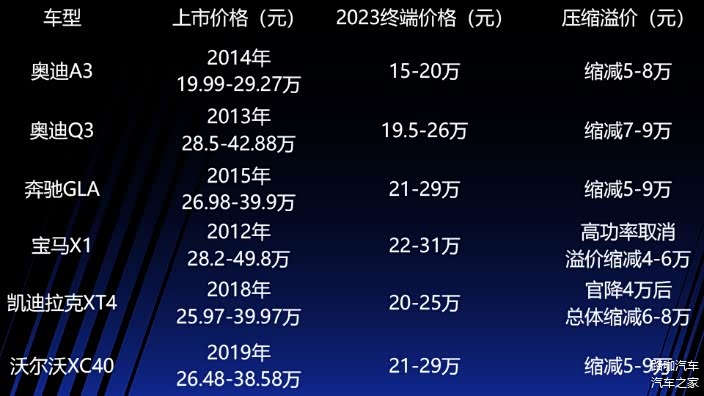 头部品牌的入门级车型,已经失去高溢价能力。早在2014年开始,豪华品牌在中国开始了一轮国产入门车型的风潮,第一批包括奥迪A3、奥迪Q3、宝马1系、宝马X1、宝马X2、奔驰A级、奔驰GLA,之后凯迪拉克XT4、沃尔沃XC40、雷克萨斯UX等陆续跟上。