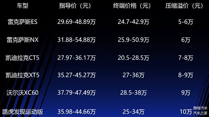 另外,二线品牌的诸多车型车型,已经失去高溢价能力。除了奔驰宝马这2个头部品牌之外,其余同类车型如今在同配置车型上几乎处于同一价格水平,如B级-C级轿车如今的销量主力版本成交价均在20-28万元之间,而支撑豪华品牌销量数字的主力,中型SUV,如今二线品牌的终端裸车价均在25-35万元之间,与BBA同类产品的价格差距在10万元左右。