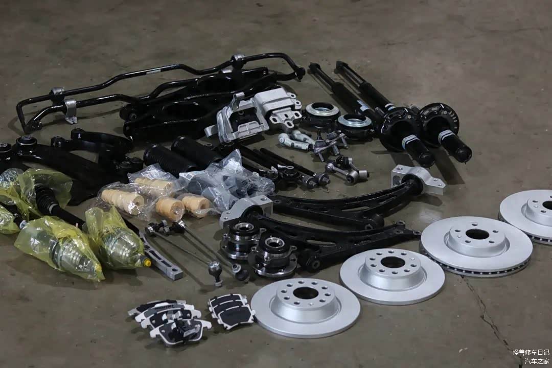 底盘全面整备,满地配件。没错,全车更换,小到固定螺丝、防尘套,大到避震、摆臂、刹车盘,一步到位,恢复出厂。