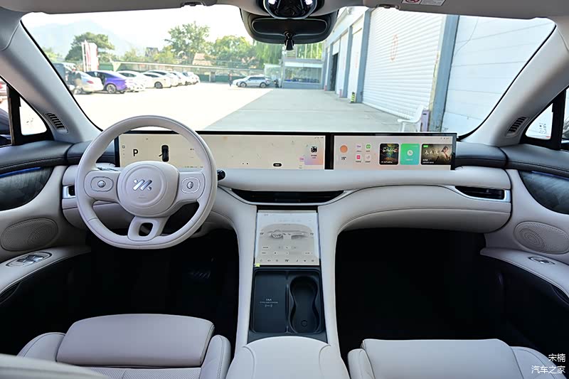内饰方面智己LS6基本延续了LS7的风格,浅米色的主体配合气泡风格设计,简约、温馨和质感都凑齐了。中控台上还是那套可以升降的横向“带鱼屏”,其中主屏26.3寸+副驾屏15.5寸。底部还有一块竖向的用于空调和车控的10.5寸中控屏。