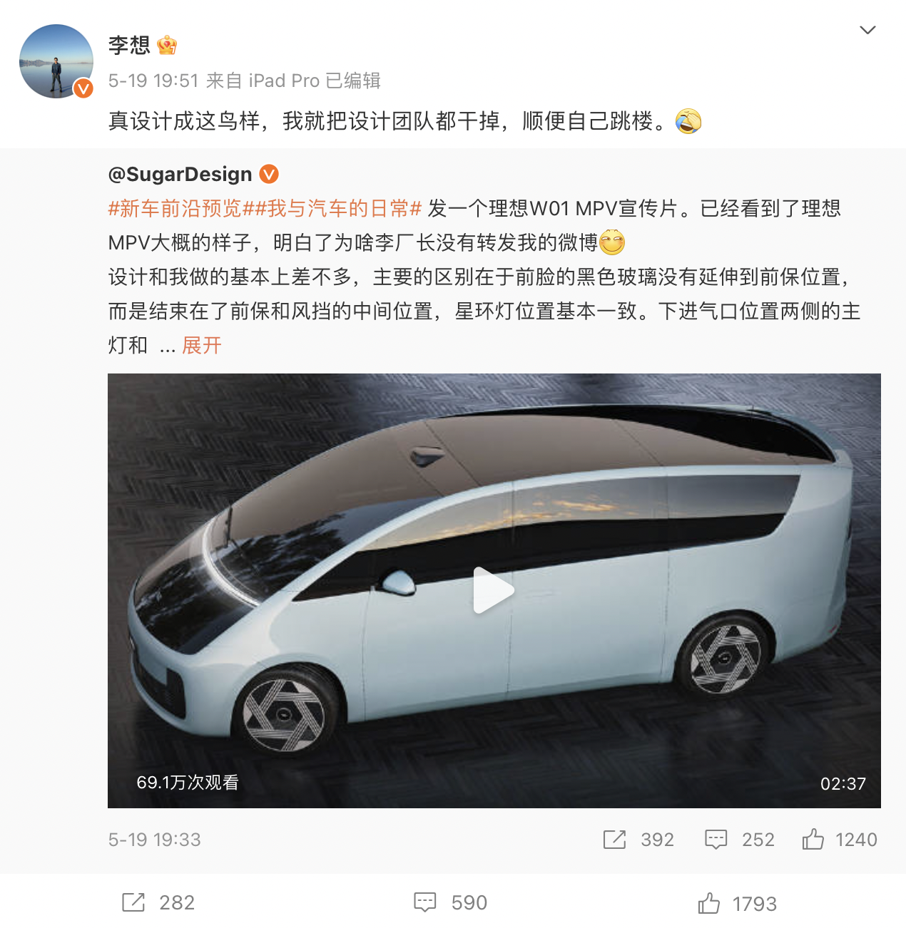 非汽车设计专业出身,对于这台触及灵魂的MEGA外形设计,不敢有太多评价。只是感觉在极致的空气动力学设计下,风阻一定会出奇的低,和高铁P在一起也毫无违和感。只是感觉一方面为了追求极致风阻,一方面为了追求后排的乘坐空间+舒适性(第三排估计也不会太舒服),直接拼接组合,感觉上总是怪怪的,不协调,让我想到了一个“不太吉利”的车型。我不敢说丑(其实是真丑),只能引用李想自己的评价:设计成这鸟样!!!