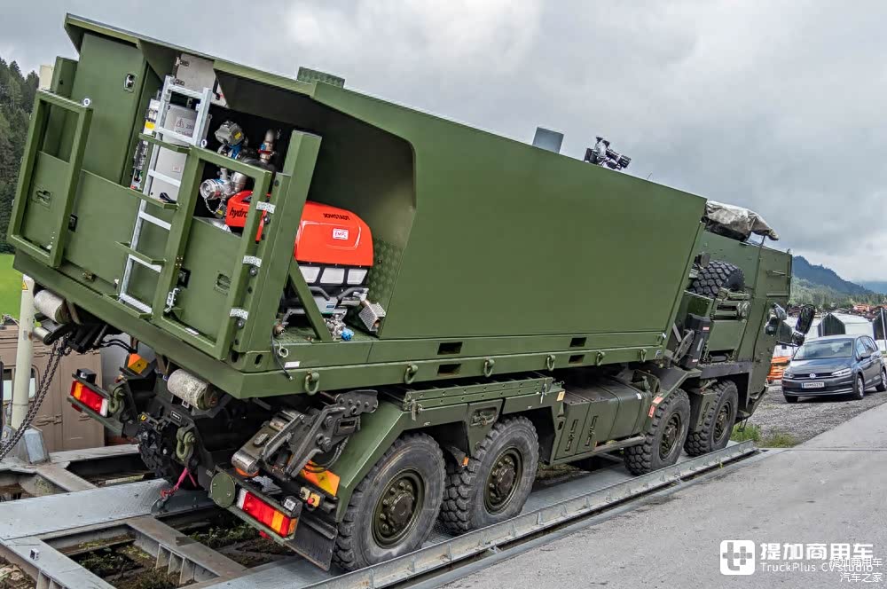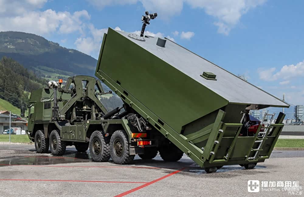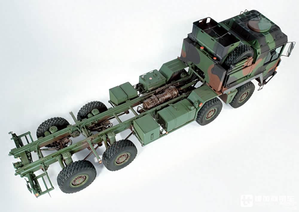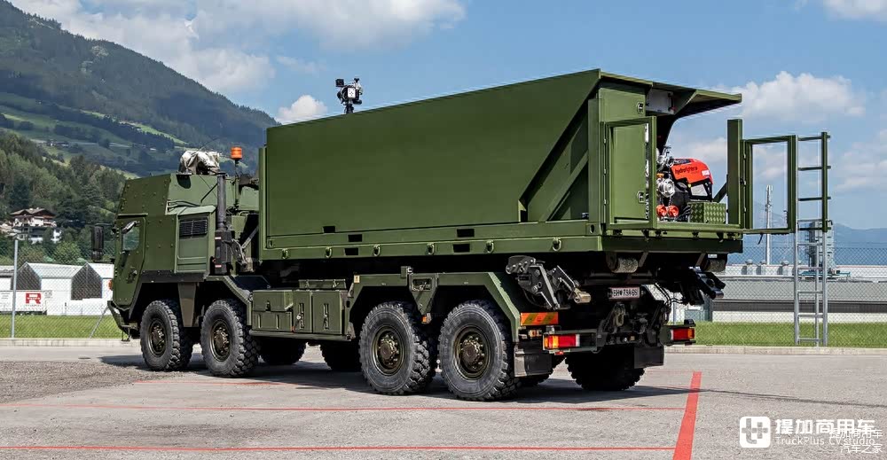 上图就是我们今天文章的主角:基于莱茵金属曼恩SX 45 8x8军卡底盘打造的消防车。它的上装由安普打造,采用拉臂钩设计,提升了整车的灵活性。为什么说它特殊呢?原因就是:它采用的是莱茵金属曼恩SX系列军卡底盘,而非我们常见的HX系列军卡底盘。