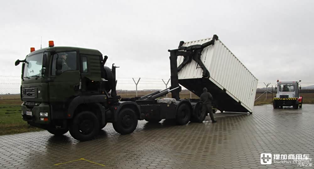 车辆搭载的拉臂钩系统来自奥地利帕尔菲格,型号为Scorpion T17。这是一款军用拉臂钩系统,它配备了附加的集装箱夹具,可与集装箱扭锁对接,实现集装箱自装卸。由于集装箱夹具采用了独特的造型设计,并且能够通过变形来适应集装箱类型,因而得名Scorpion“蝎子”。