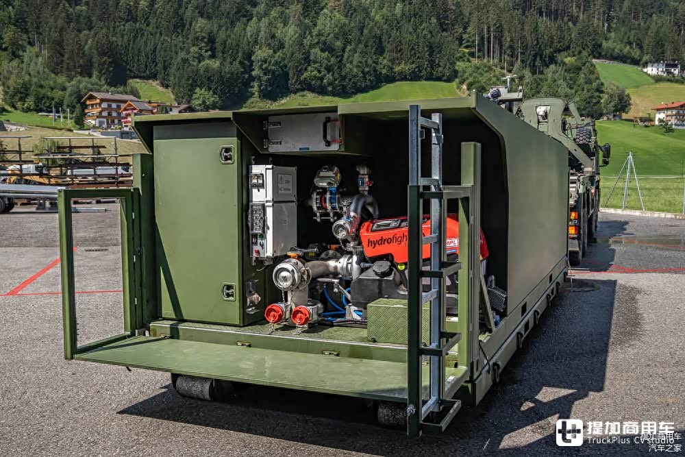 消防上装由奥地利安普打造,采用模块化设计,可通过车辆搭载的拉臂钩系统进行快速的拆、装。上装水箱容积为13500升,配备了一台安普Hydrofighter Tornado II 便携式消防泵。这台消防泵由独立的45千瓦双缸汽油机提供动力,输出量达2000升/分钟。