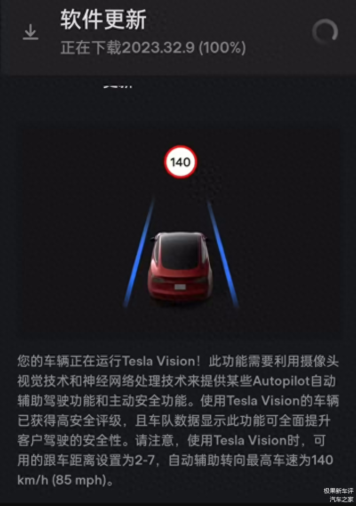 不过需要注意的是,使用 Tesla Vision 时,可用的跟车距离设置为 2-7,自动辅助转向最高车速为 140km/h (85 mph)。