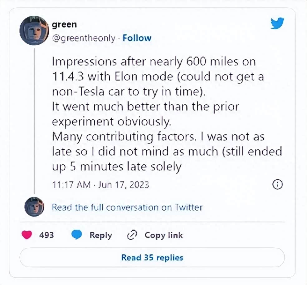 不过当时Green也表示,在使用 FSD 测试版 V11.4.3 的过程中,开启了“埃隆模式”,并进行了一次 965 公里的公路旅行。