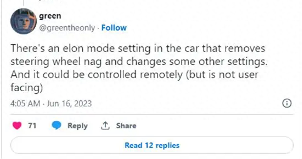 除此以外," 埃隆模式 " 下,特斯拉汽车可能会随机变道或者以较慢的速度行驶,但这种模式可能会引发其他司机的“路怒症”。