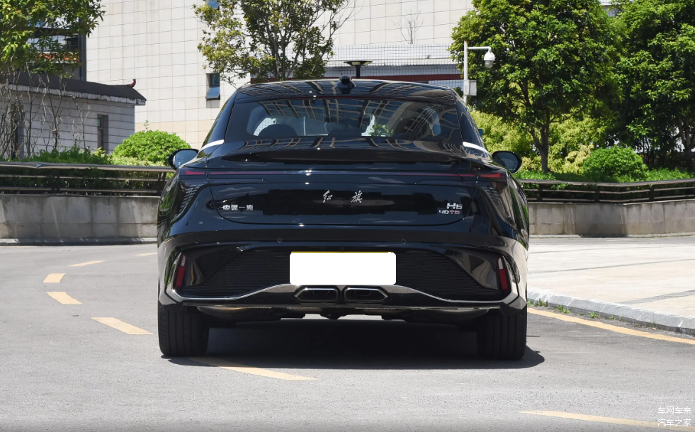 相比于车头和车侧,红旗H6车尾造型引起的争议更大一些,首先最上方是小尾翼,接下来是融入分体式设计,像鲸尾一样的贯穿尾灯。梯形熏黑下包围造型略显复杂,表面同时加入起伏不平的横幅装饰条、车牌、中置双出排气口、反光条以及贯穿金属饰板,个人感觉有些浮夸,尤其是中置双出排气口的出现有些大材小用,主要是跟整体设计风格不太相符。