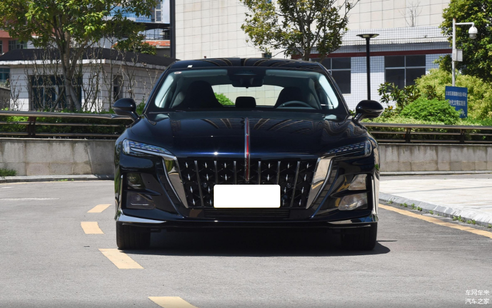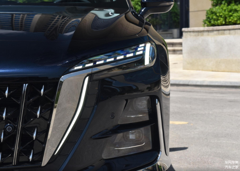 不过,看到直瀑式前格栅以及旗标的瞬间,还是能够迅速辨别出红旗身份。毕竟它的灵魂不能丢,否则这就不是红旗了。车头轮廓方中带圆,没有印象中那么方正敦厚,直瀑式前格栅在熏黑背景表面镶嵌金属点以及竖状饰条,二者交叉分布,看起来没有常规直瀑式设计那么死板。引擎盖中间的标志性旗标从引擎盖延伸至格栅中间位置,再次增强辨识度和原创度。格栅两侧镶嵌不规则金属饰板,与融入点阵式设计的LED大灯连接,而采用分体式设计大灯也起到提升科技时尚感的作用。