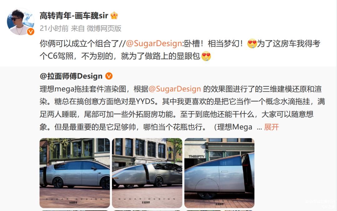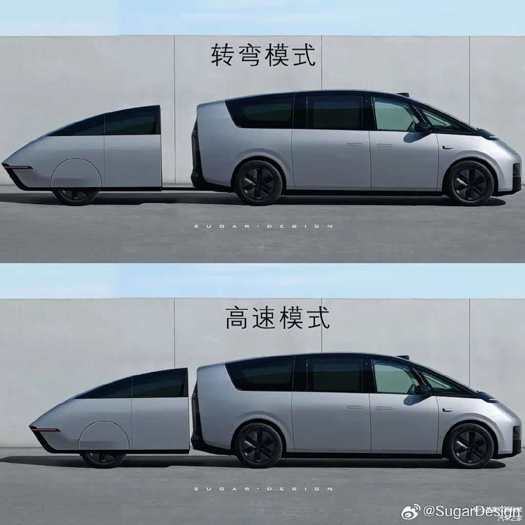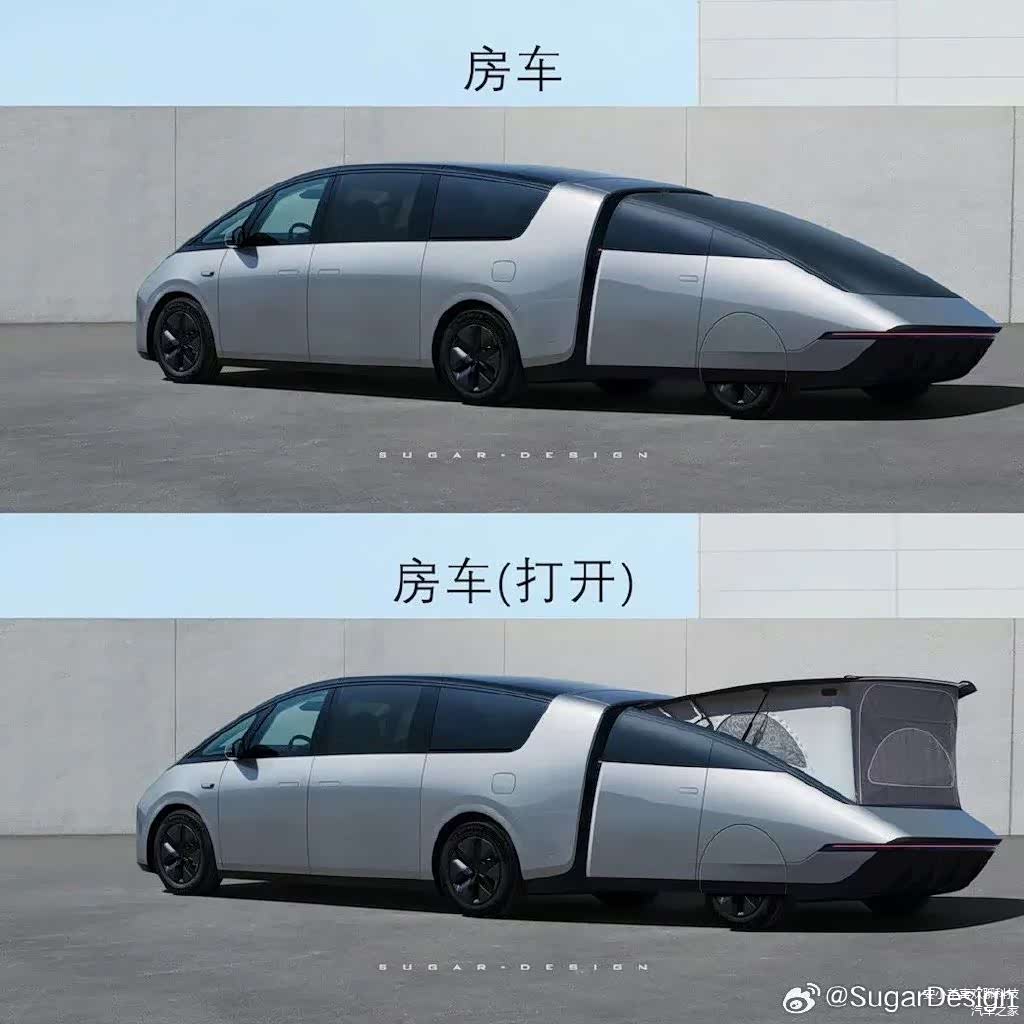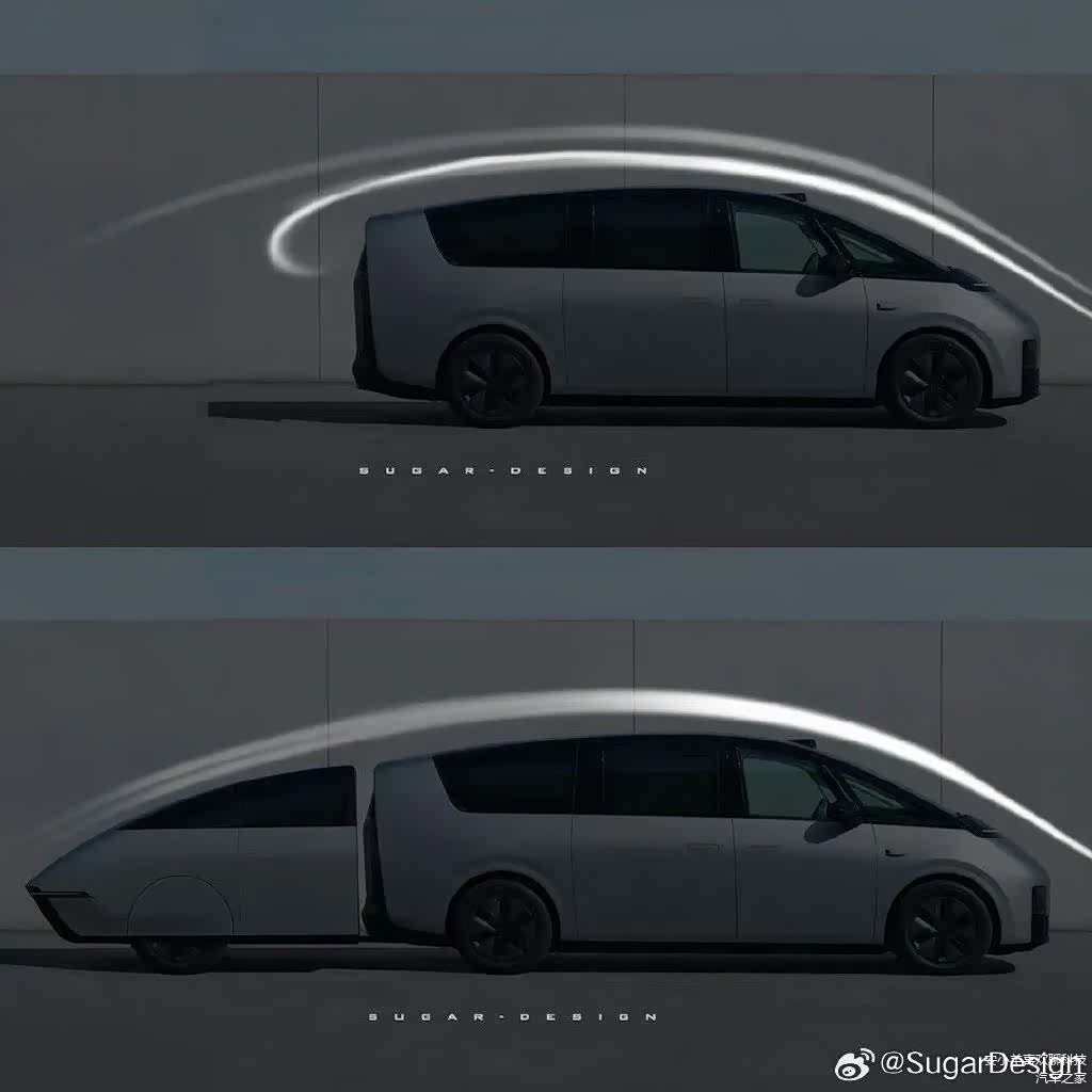 微博上的汽车设计界大咖@SugarDesign 糖总 在理想发布MEGA实车图第二天,推出MEGA的拖挂车套件Whale-Tail 系列,涵盖11座、天幕、充电宝、房车、反向驾驶功能等等: