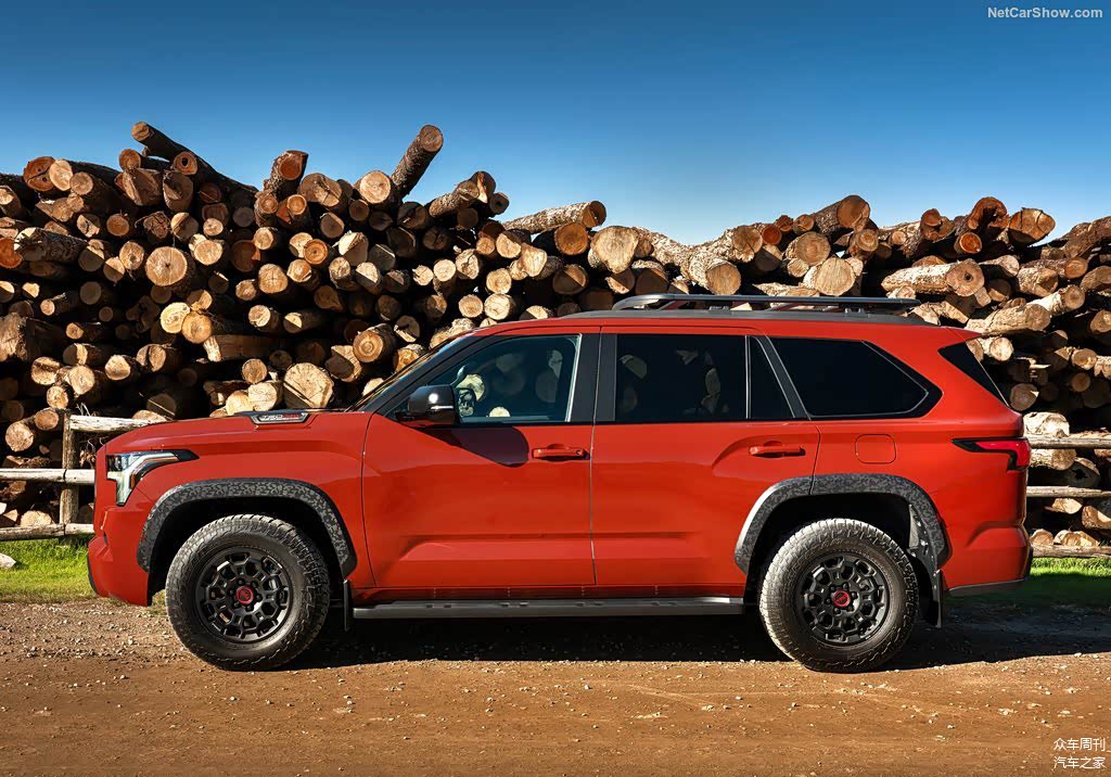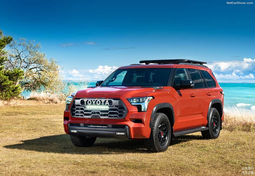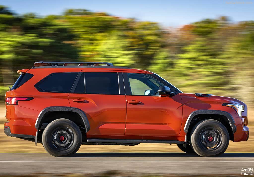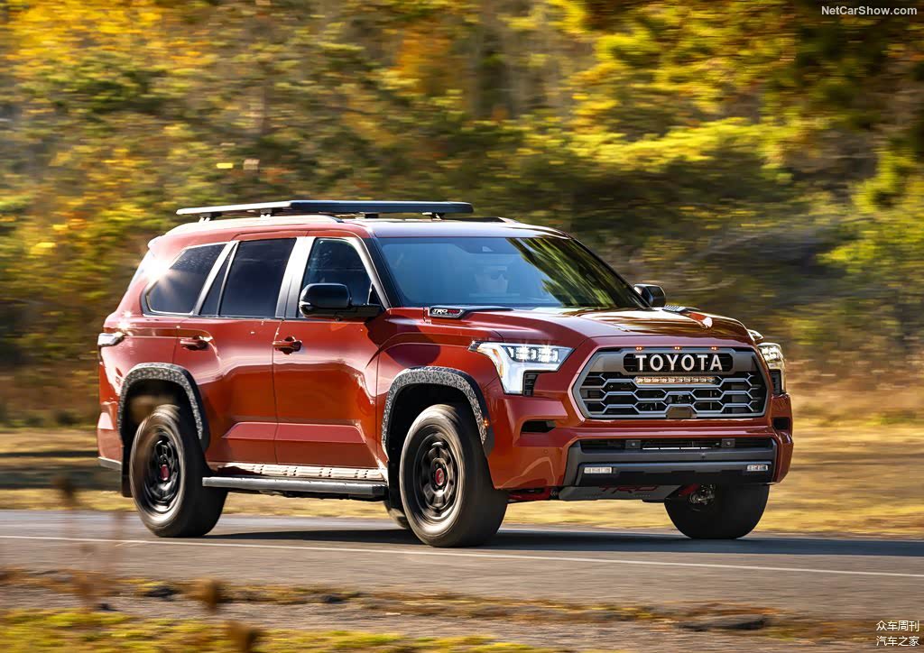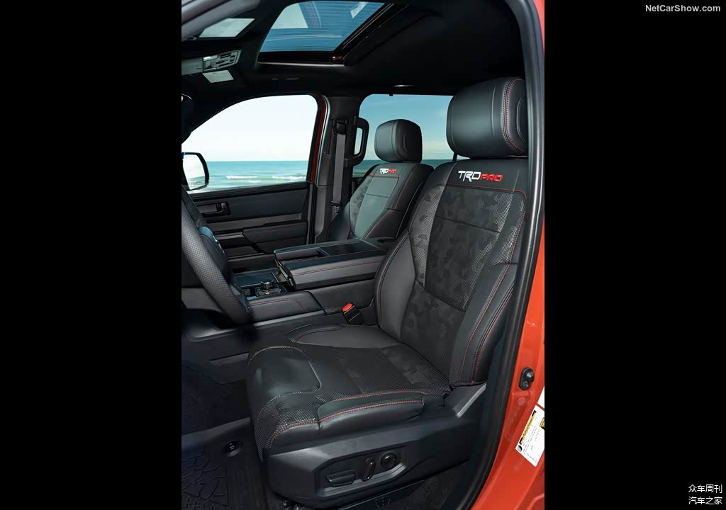外观方面,全新丰田红杉TRD Pro的中网换装了带有TOYOTA英文字母的标识,同时加入了美规的三个黄色警示灯,下部增加了户外越野灯。轮眉、下护板都换装了防剐蹭的材质,底盘发动机舱下部也增加了TRD专属防护板。整个车身进行了黑化的处理,看上去更运动。