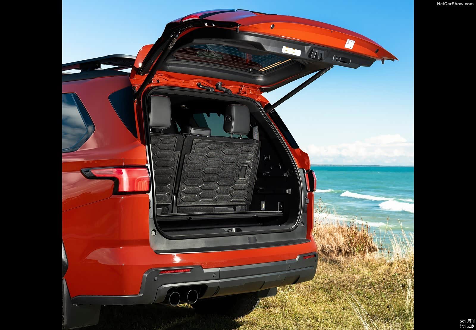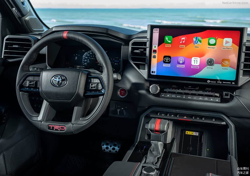 内饰方面,以黑色为主色调,并以红色作为装饰,展现出运动气质,TRD专属方向盘和挡把展示这款车的不同身份,踏板也进行了运动化的升级,红色缝线修饰的黑色座椅也加入了TRD Pro的标识,车内无不展现它的不同身份,新车采用2+2+3的座椅布局,远途旅行第二排将更加舒适。
