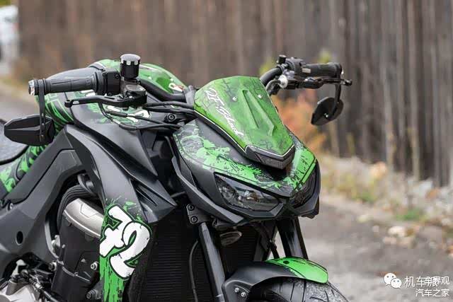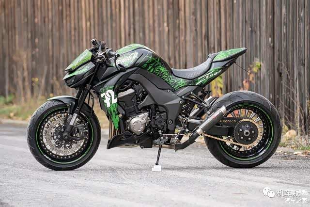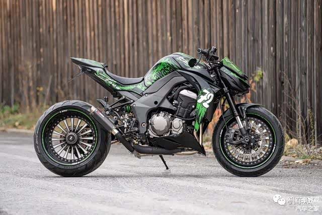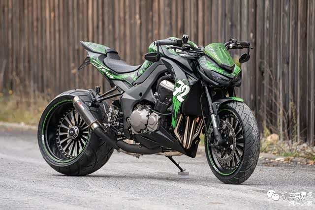 这辆改装车采用了绿色涂鸦式漆面,配备了单摇臂和前17后18寸三片式双色轮毂。最引人注目的是后轮胎的宽度达到了300毫米,这在摩托车中可以说是相当罕见的。为了与轮毂搭配,车辆两侧还安装了双色脚踏。此外,还采用了来自英国的蝎子Scorpion排气系统。至于其他改装细节,如反光镜、牛角和灯光等,就不再赘述了,因为已经达到了字数要求。