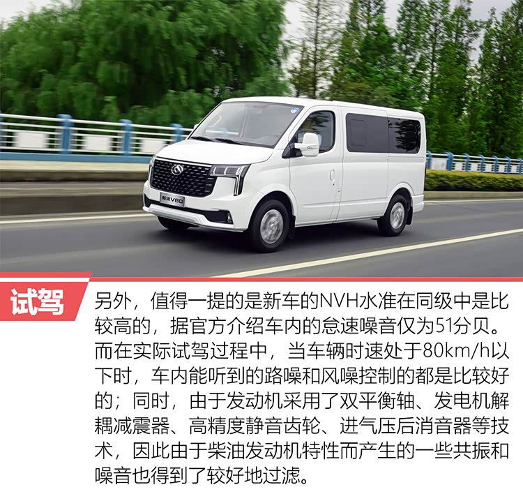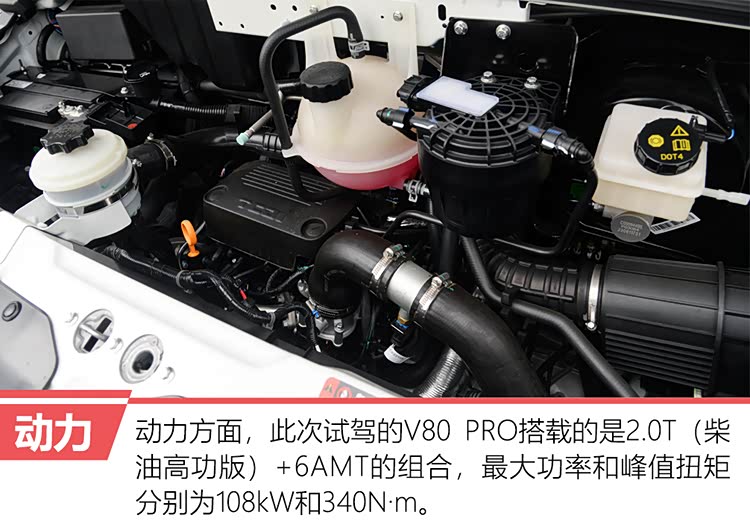 动力方面,此次试驾的V80 PRO搭载的是2.0T(柴油高功版)+6AMT的组合,此外新车还提供了低功版和手动挡车型。从硬件组合上来说,和老款V80并没有什么变化,但是上汽大通针对2024款新途V80的发动机程序进行了优化,使高功版的最大功率和峰值扭矩分别来到了108kW和340N·m,而低功版的也来到了93kW和320N·m。此外,发动机的保养间隔也延伸到了20000km一次,进一步降低了用车成本。