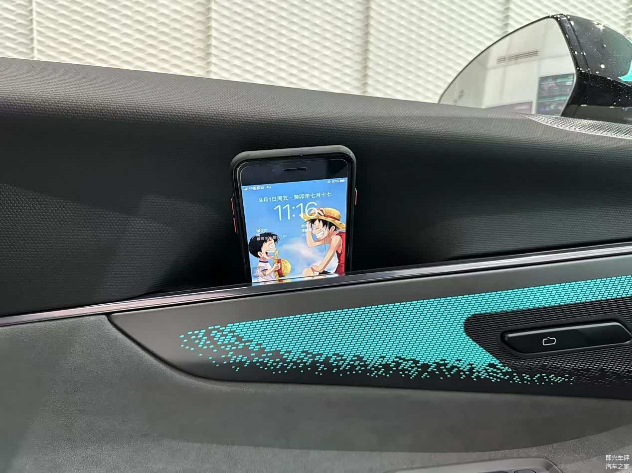 除了入门版本车型,其他版本车型都标配92英寸的AR-HUD抬头显示功能。不仅能显示车速,道路限速等信息,还能将音乐歌词投射到上面,视觉效果还是挺不错的。另外在车门两侧的饰板做成了储物空间,iPhone 8 PLUS手机完全可以放在里面,上下车时也不容易遗忘。