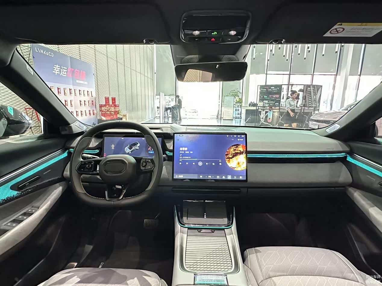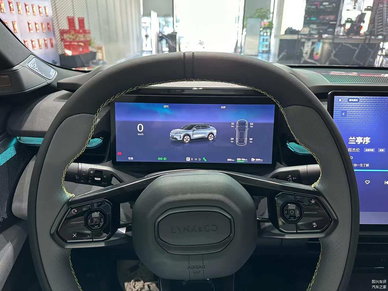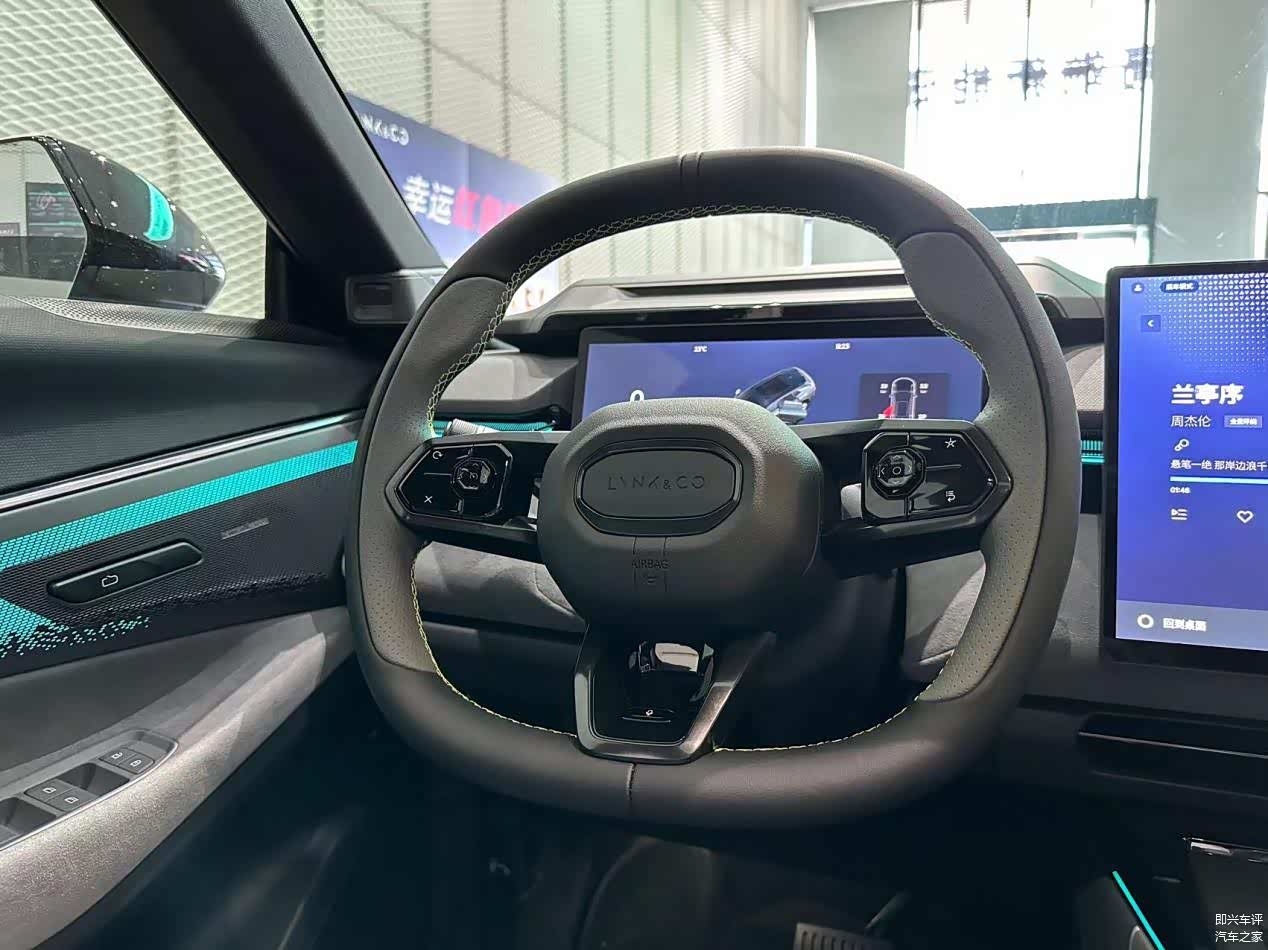 它的前后车灯都是贯穿的样式,中间部分都加入了点阵的设计元素,个人感觉更像是琴键,辨识度是比较高的。日间行车灯的造型像是一把扳手,灯带一直延伸到两侧翼子板。车门两侧黑色装饰板上的领克标识在充电时会呼吸闪烁,看上去挺有科技感的。前后车门都是无边框造型,如今这样的设计在当下已经不少见了,但也吸引了不少年轻消费者。