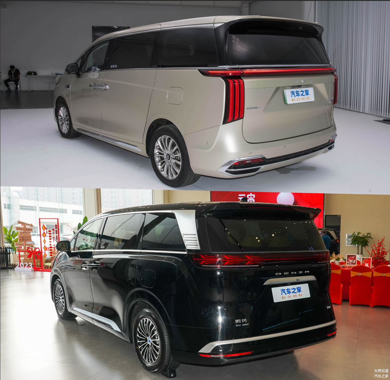 来到车身侧面及尾部,两款车型都采用传统MPV方正的造型设计,魏牌高山的车身线条较为柔和,腰线呈现出一定的弧度,同时车顶还采用了悬浮式设计,并在车窗框线、门把手、侧裙以及尾部使用了大量的银色饰条,整体看起来更加时尚高级,此外,车尾的设计较为简洁,粗壮的贯穿式尾灯组,点亮后具有出色的视觉效果,而腾势D9的车身线条比较平直有力,尾部造型也比较简洁方正,并配备了贯穿式的LED尾灯,点亮后的辨识度同样很不错
