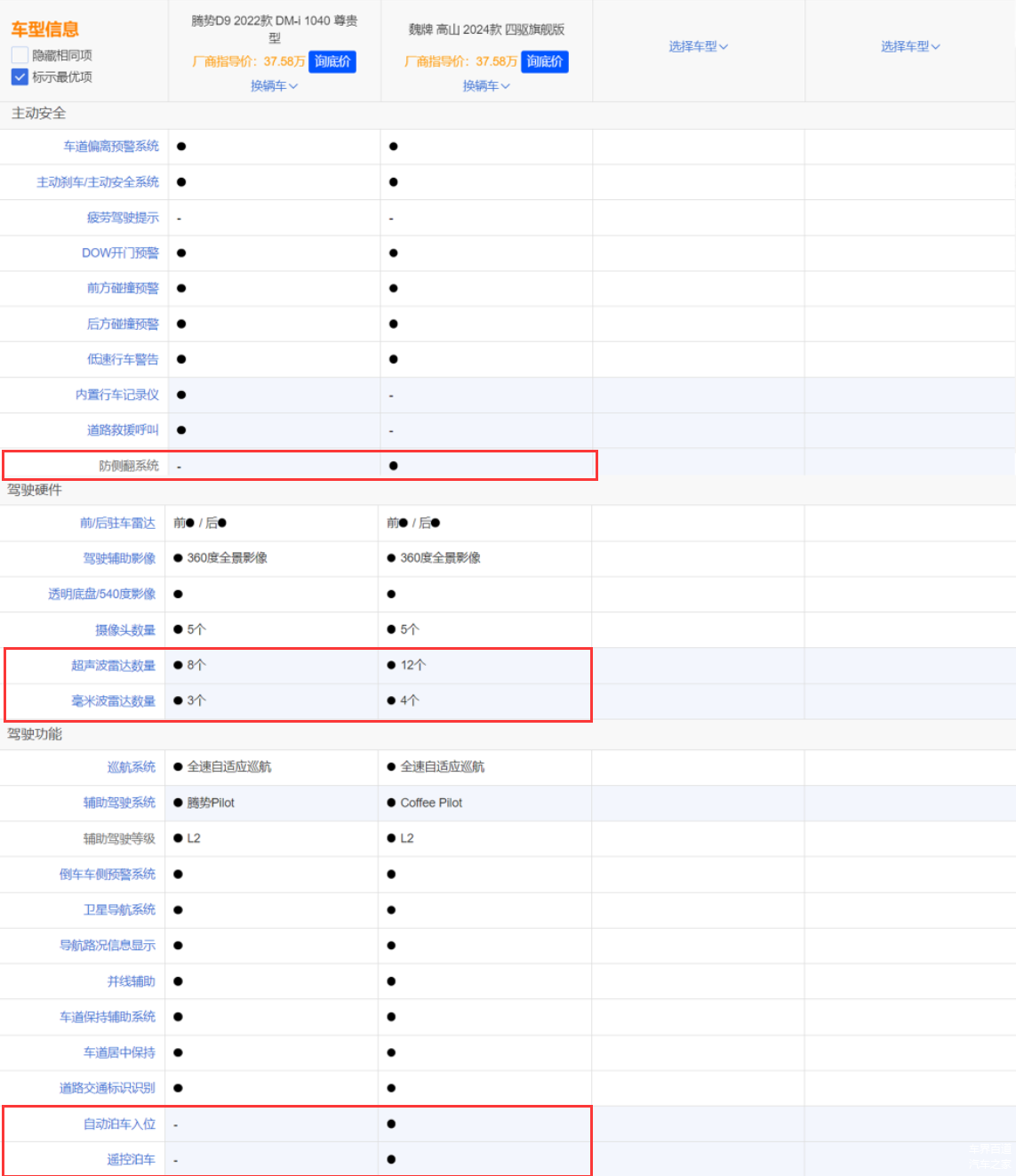 在安全驾驶辅助配置方面,魏牌高山和腾势D9都配备了主动刹车、前后方碰撞预警、车道偏离预警、DOW开门预警、并线辅助、车道居中保持辅助、道路交通标识识别、倒车车侧预警、并线辅助、全速自适应巡航、前后倒车雷达、360度全景影像、540度透明底盘等配置。可以辅助功能直接拉满,不过魏牌高山的超声波雷达数量达到了12个、毫米波雷达达到了4个,而腾势D9的超声波雷达只有8个,毫米波雷达只有3个,所以辅助驾驶灵敏度会更出色,另外,魏牌高山还多出了防侧翻系统、自动泊车入位、遥控泊车等实用功能
