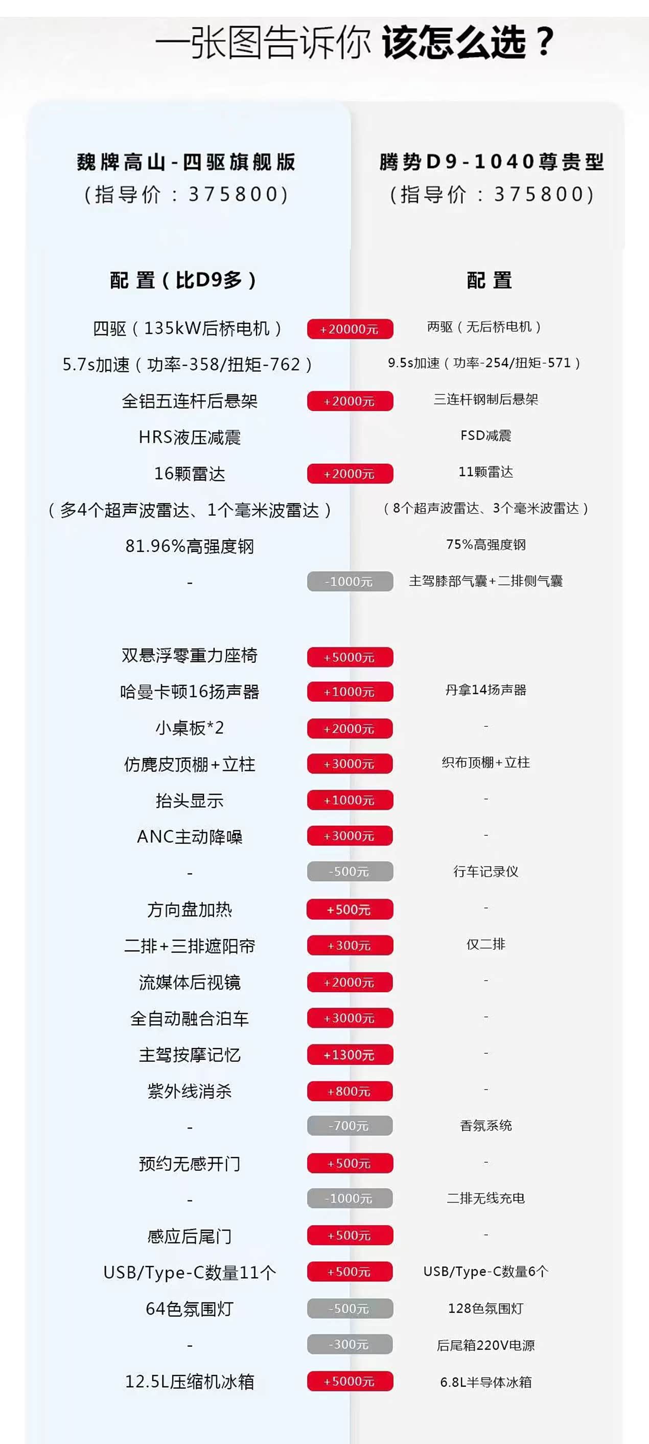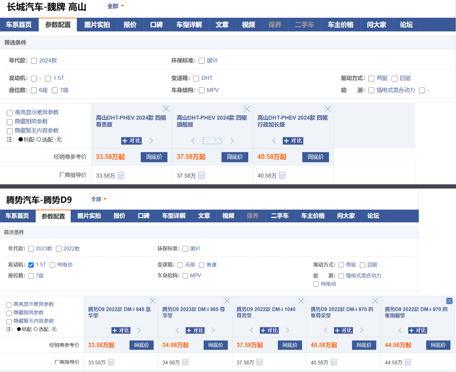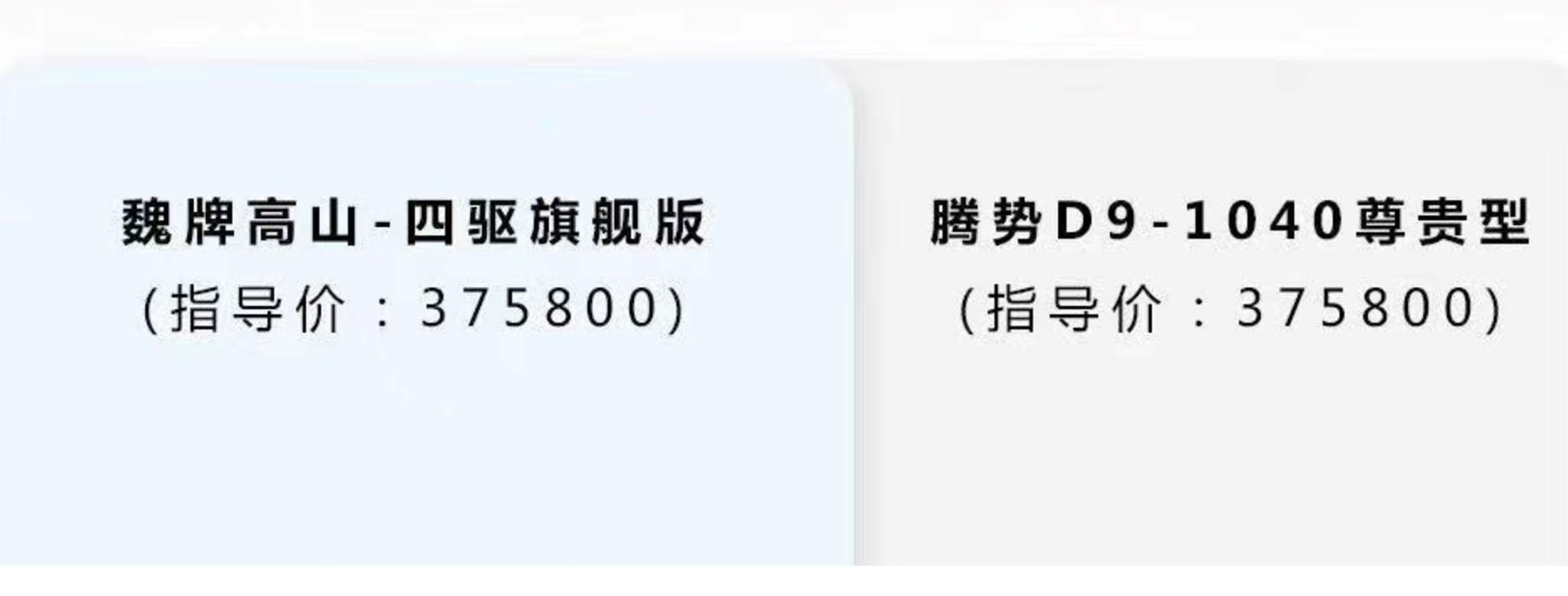 魏牌高山是10月18日上市的,虽然出道晚,但却是有备而来,目前,魏牌高山DHT-PHEV共有3款配置车型在售,分别是四驱尊贵版、四驱旗舰版以及四驱行政加长版,售价区间为33.58万至40.58万元,而腾势D9 DM-i共有5款配置车型在售,分别是945豪华型、1040尊享型、1040尊贵型、970四驱尊荣型以及970四驱旗舰型,售价区间为33.58万至44.58万,从车型配置和定价来看,魏牌高山虽然入门价和腾势D9相同,但是车型配置更加简洁,用户也选择起来也更加方便,其次,从车型命名就可以看到,魏牌高山全系是标配四驱系统的,并且顶配车型价格腾势D9更便宜,反观腾势D9的四驱系统只有次顶配和顶配才有