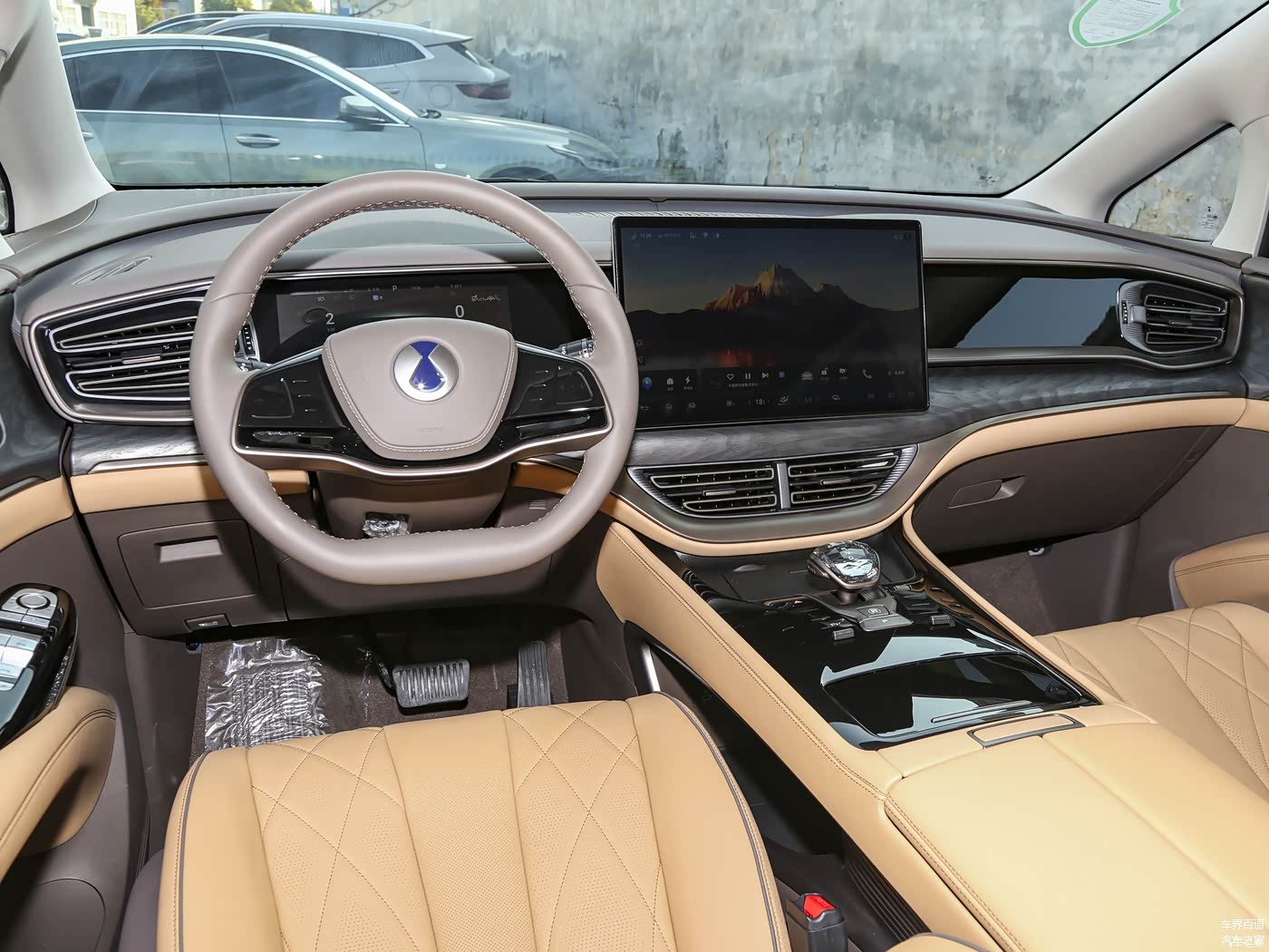 在内饰方面,魏牌高山和腾势D9 的设计都非常注重舒适感和豪华感,魏牌高山的内饰采用了Coffee OS智能座舱设计,并搭载了Coffee OS车载系统,内置GPS导航系统,同时还支持语音控制和手势控制,并且在浅色调、大量软质材料以及木质饰板的装饰下,给人一种非常居家温馨的感觉,全车最大的亮点当属27英寸双联屏的设计,屏幕分辨率达到了4K水平,并标配多指飞屏操控功能,进一步增强了该车的科技感,值得一提的是,魏牌高山还保留了较多的物理功能按键,可以控制音量、电话、巡航等功能。操作起来更加的便利,而方向盘后方还有换挡拨片,可以实现手动换挡,增加了驾驶乐趣,另外,手机无线充电功率达到了50W,还支持ETC装置