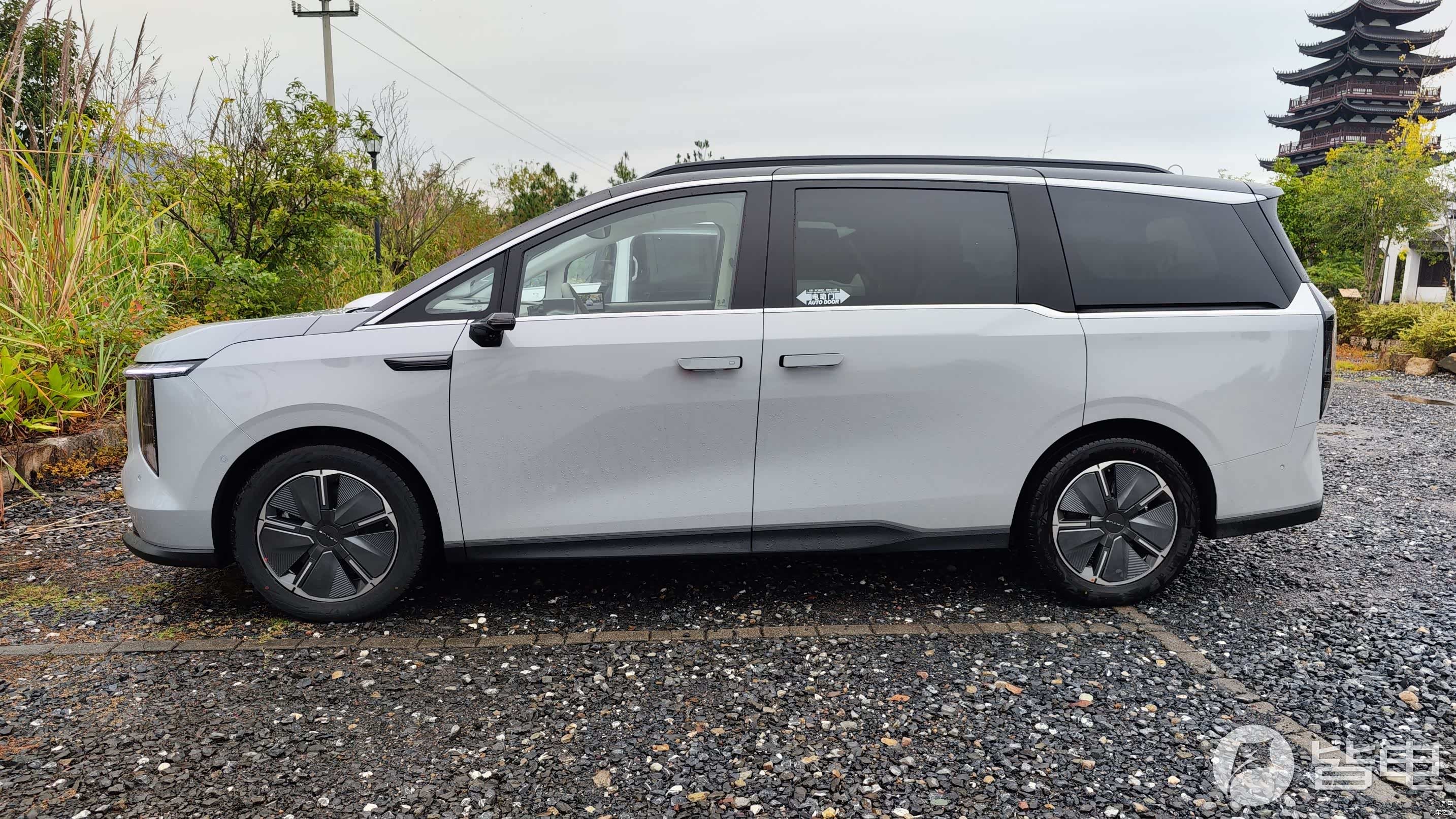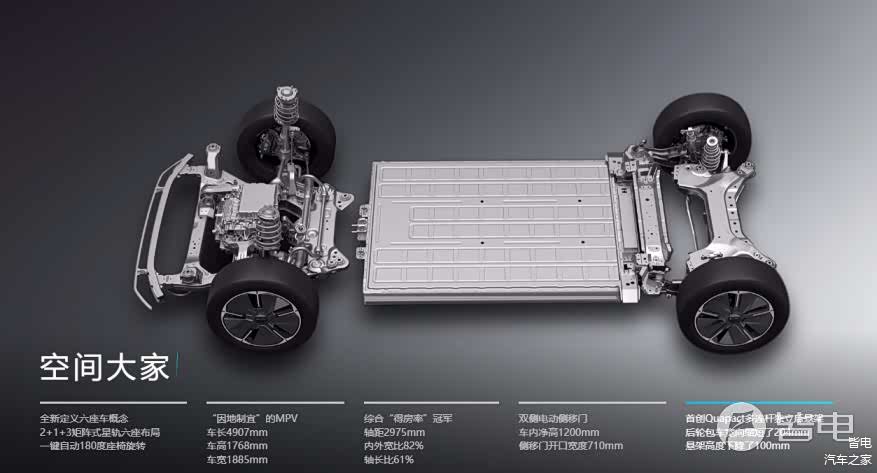 车身长宽高分别为:4907mm/1885mm/1756mm(不含行李架),轴距达到2975mm,为5米内新能源MPV轴距最长,并在纯电MPV车型中具备最低地板离地高度,仅404mm。