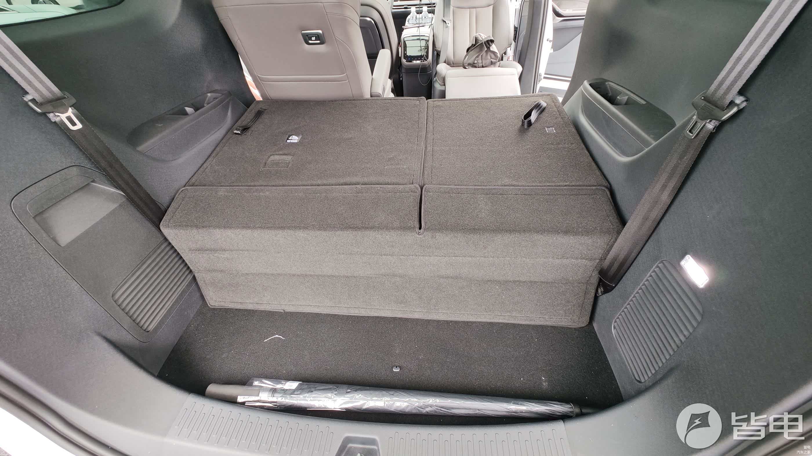 三排翻倒后,行李箱纵深为1210mm,容积可拓展至760L。工程师说后面还会出一个类似于储物箱一样但外面带有相同材质的配件,能够把最后面这里的凹陷填平,和三排座椅形成一个大平台。