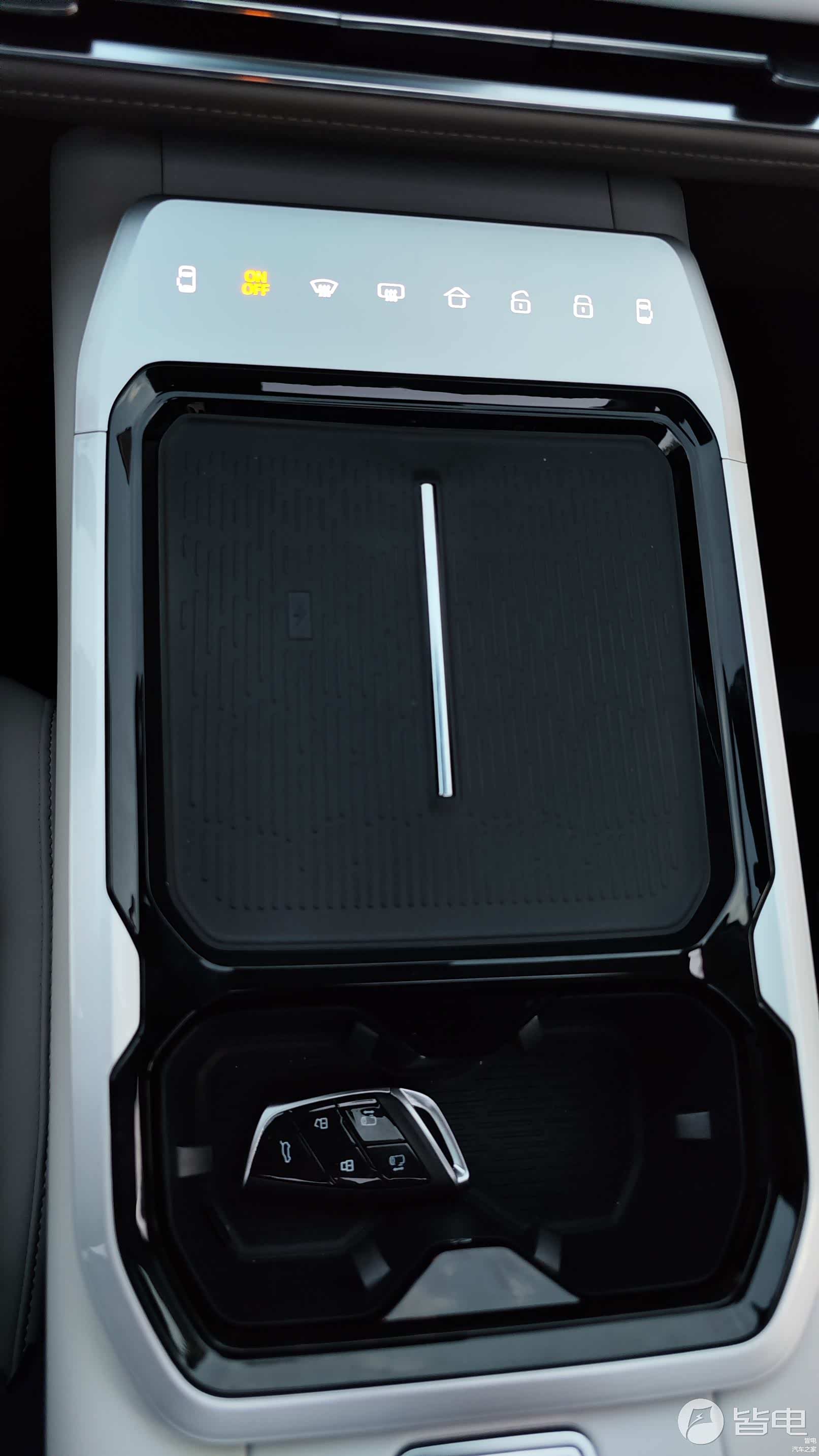 后面则是一个放手机的区域,有最高15w的无线充电,但是只有左侧有,而且还不带风冷,个人觉得这个点还是比较尴尬的,然后就是两个杯架和扶手箱。