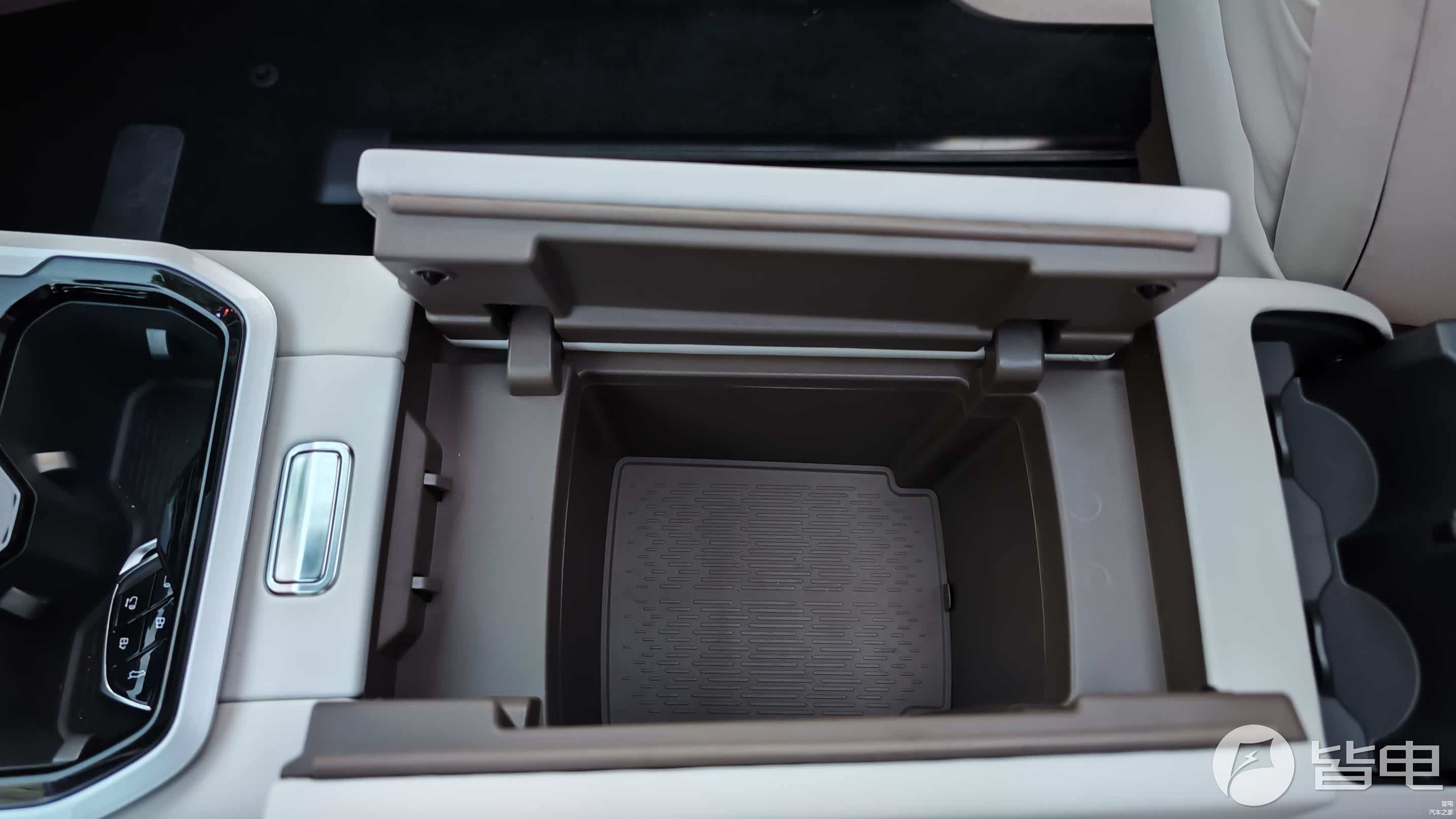 扶手箱开口很大但是空间中规中矩,扶手箱后面则是二排杯架和一个空调冰箱控制按钮面板以及冰箱。