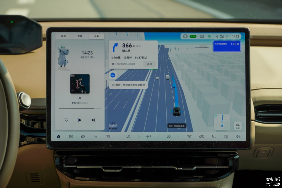 而我们试驾的昊铂HT车型为670后驱特高压NDA版,顾名思义除了纯电续航670km、支持800V特高压快充外,还有ADiGO PILOT 5.0智能驾驶的NDA领航辅助功能。在繁忙的广深沿江高速上,有特别多的半挂货车通行,打开高速NDA后,昊铂HT可以根据路况自动变道远离大车,甚至可以根据旁边车辆的车速,自动加减速变道,保证不影响其他车辆和安全的情况下变道。同时昊铂HT的高速NDA还支持进出匝道,可以根据车流速度,在合适时候变道出匝道,动作相当果断。