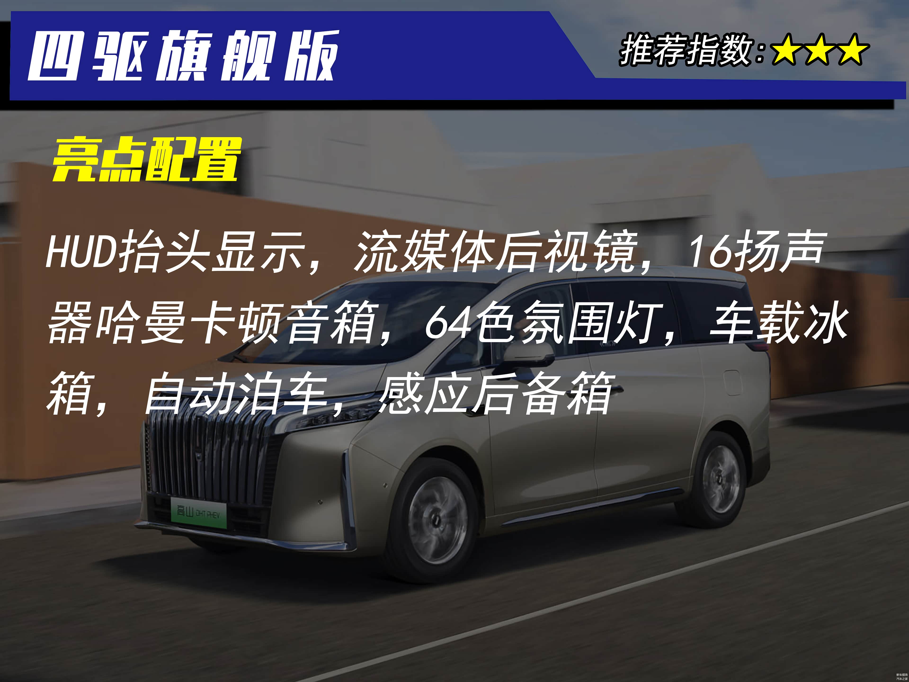 四驱旗舰版的官方售价为37.58万元,相比四驱尊贵版贵了4万元,车身尺寸,动力系统以及座椅布局都是一样的,配置方面多了HUD抬头显示,流媒体后视镜,16扬声器哈曼卡顿音箱,64色氛围灯,车载冰箱,自动泊车,感应后备箱等等。可以看到四驱旗舰版的配置进一步丰富了,可以说是锦上添花的车型。