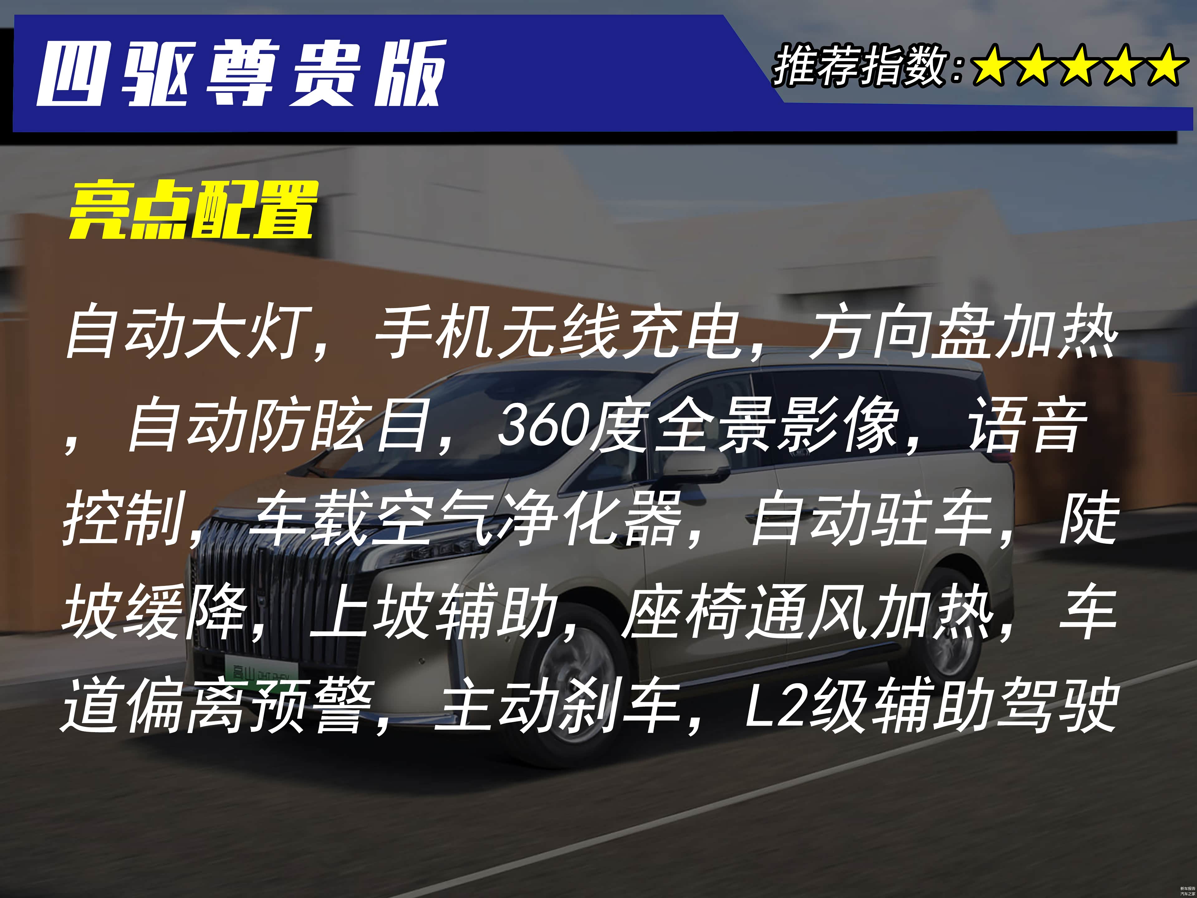 四驱尊贵版的官方售价为33.58万元,采用的是2+2+3的7座布局。该车型的配置已经非常丰富了,像是自动大灯,手机无线充电,方向盘加热,自动防眩目,360度全景影像,语音控制,车载空气净化器,自动驻车,陡坡缓降,上坡辅助,座椅通风加热,车道偏离预警,主动刹车,L2级辅助驾驶等等都有配备。可以看到,这样的配置表现已经非常全面了,目前主流的配置都没有缺席,舒适性配置和主被动安全配置也都兼顾到了。四驱尊贵版这款车型可以说是非常有性价比了。个人也最推荐这款车型。