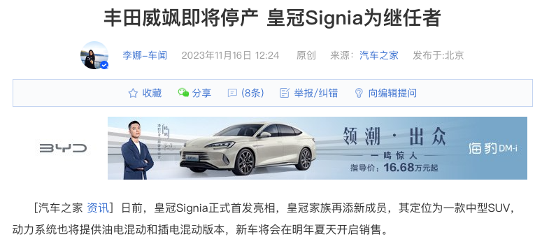 皇冠Signia正式亮相后,北美丰田公司总经理Dave Christ确认,该车上市销售后,现有的Venza将在2024年停产。由于两车定位及目标消费群体高度重合,公司决定简化产品线。