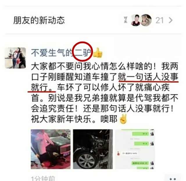 后来小编了解到,虽然这辆车是网红二驴的,但当天驾驶这辆车的并不是他。为了让网友和粉丝们放心,二驴自己发文告诉了大家。当时朋友借走了自己的车,一时转弯没有控制住,就撞上了这棵大树。还说到:只要人没事就行,车不车的无所谓,就算是代驾开自己的车撞了,也不会追究,主张人大于一切。这种言论也只有富人说得出口了,平常人谁愿意呢,这让小编不禁感叹网红到底多有钱?库里南被朋友开上树,还能淡定回应人没事就好!
