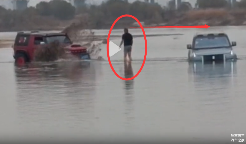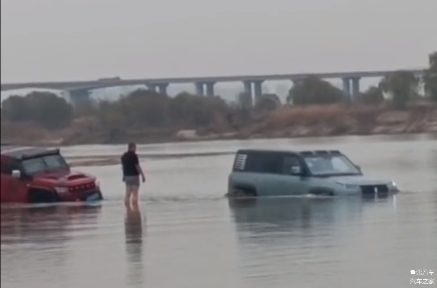 另外注意这个角度没有变化,此时仰望U8还深陷淤泥之中,同时注意上图红圈内站在中间的人,发现问题没有?小腿肚都能看到,也就是说,人较轻的情况下,这淤泥还是能够承受一定重量的,这可能是仰望U8一时大意的主因所在,再来看看人的高度,对比边上的仰望U8就能发现,身高超过车顶高度不少,而仰望U8的车身高度是1.93米,除非这人身高比姚明还高,否则不正常,进而说明仰望U8深陷淤泥的幅度,毕竟整个前保险杠全部没入水中,甚至连散热格栅都只能看到一半,由此可见陷入的有多深。