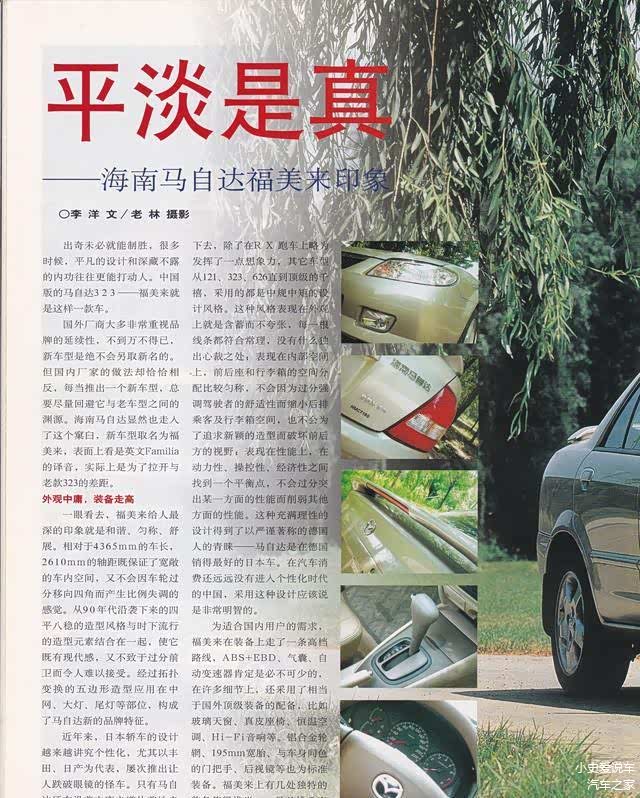 下面我们继续跟着汽车之友杂志2002年第9期,一起回顾一下海南马自达2002年推出新车型福美来。福美来,英文名FAMILY,意为家庭,顾名思义,其是一款不折不扣的家用轿车。该车引进自日本马自达323系列车型,亮相于2000年的巴黎车展。