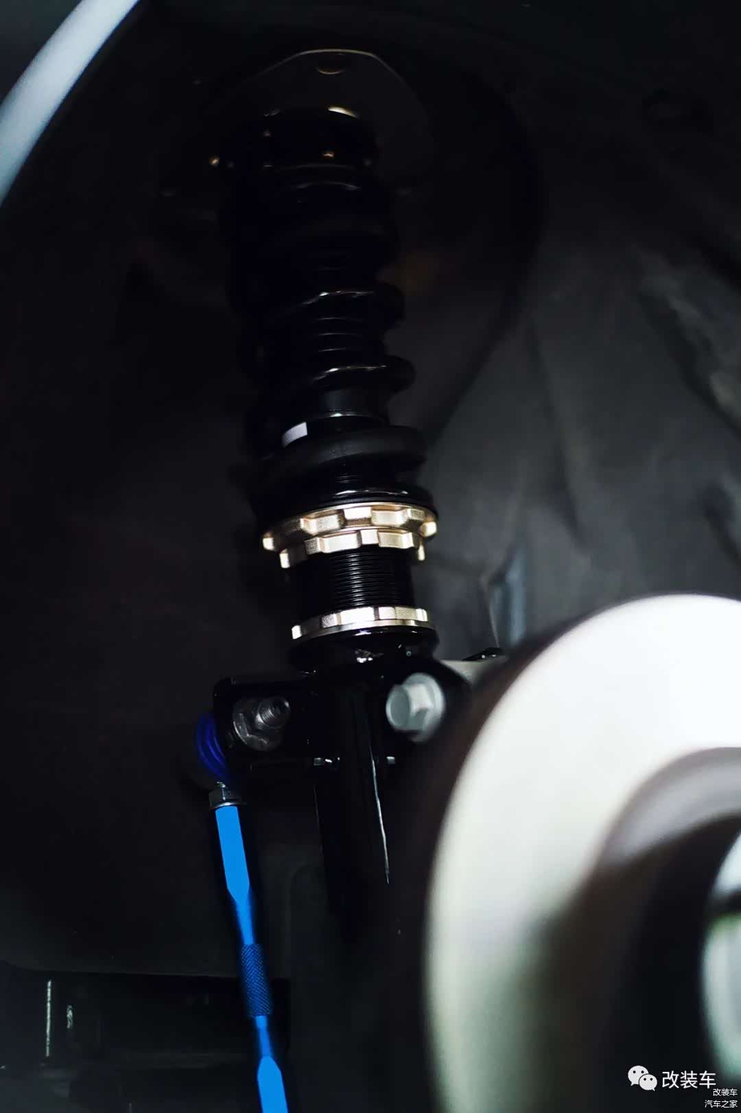 "车到我手后改装的第一样就是避震,因为我有开过朋友的原厂车,感觉原厂的支撑性太差了,所以第一时间安排了一套BC BR绞牙避震+鱼眼塔顶上车,提升操控的同时姿态也更好看了。"
