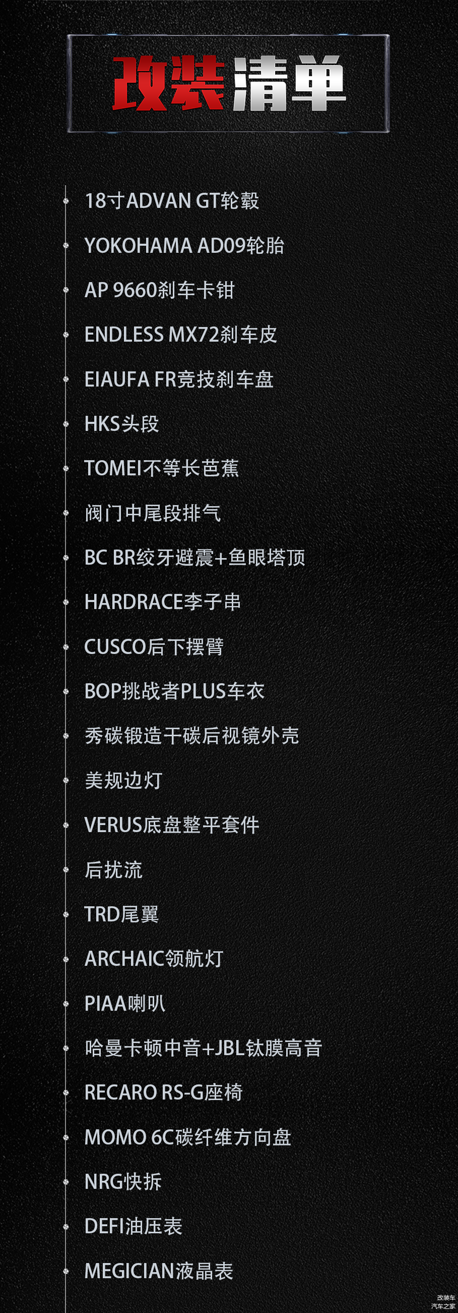 "操控方面,除了绞牙避震之外,还换上了HARDRACE李子串、CUSCO后下摆臂,让车子开起来更加灵活。"