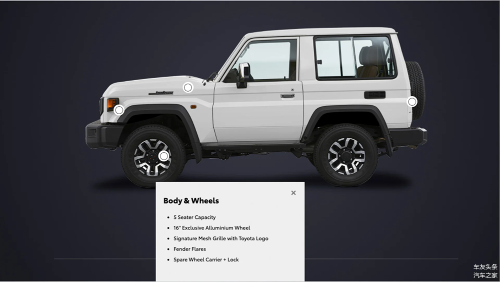 LC71比五门的LC76轴距上短了420毫米,并且仅提供VXR规格,其配备了16寸铝合金轮圈、LED大灯和雾灯,并提供灰色、米色、银色、白色四种外观颜色。内饰部分,丰田为这款修补了几十年的老古董配上了支持无线Apple CarPlay和Android Auto的9英寸中控屏。座椅材质也不再是织物,而是换成了棕褐色的皮质座椅。离谱的是,丰田还为其配上了预碰撞检测系统、车道偏离预警和自适应远光灯。