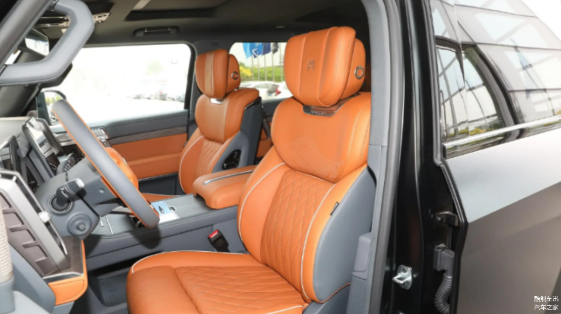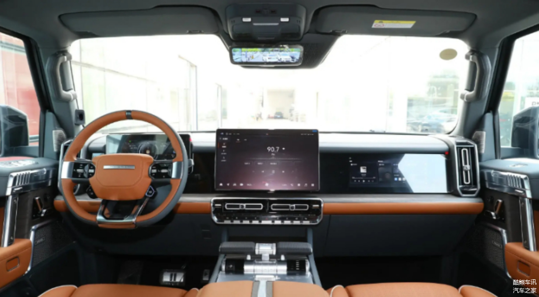 向内进入车内,猛士917的内饰气质完全不同于外观的硬朗风格,兼顾了科技感和豪华感。三幅式的方向盘设计十分简约,搭配15.6英寸中控屏、12.3英寸悬浮式液晶仪表盘和12.3英寸副驾驶显示屏,给人一种高级别的感觉;座椅则采用传统的排列方式,空间富裕,为驾驶员和乘客提供了足够的空间舒适度,再加上内饰周边的装饰件形成的视觉包裹,进一步提升了高级感。