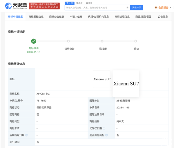 天眼查消息,11月15日,小米科技有限责任公司申请注册“XIAOMI SU7”商标,国际分类为健身器材,当前商标状态为等待实质审查。此前工信部最新一批新车申报目录显示,小米汽车首款车型“小米SU7”正式、完成申报,或由北汽代工,预计2024年上市。