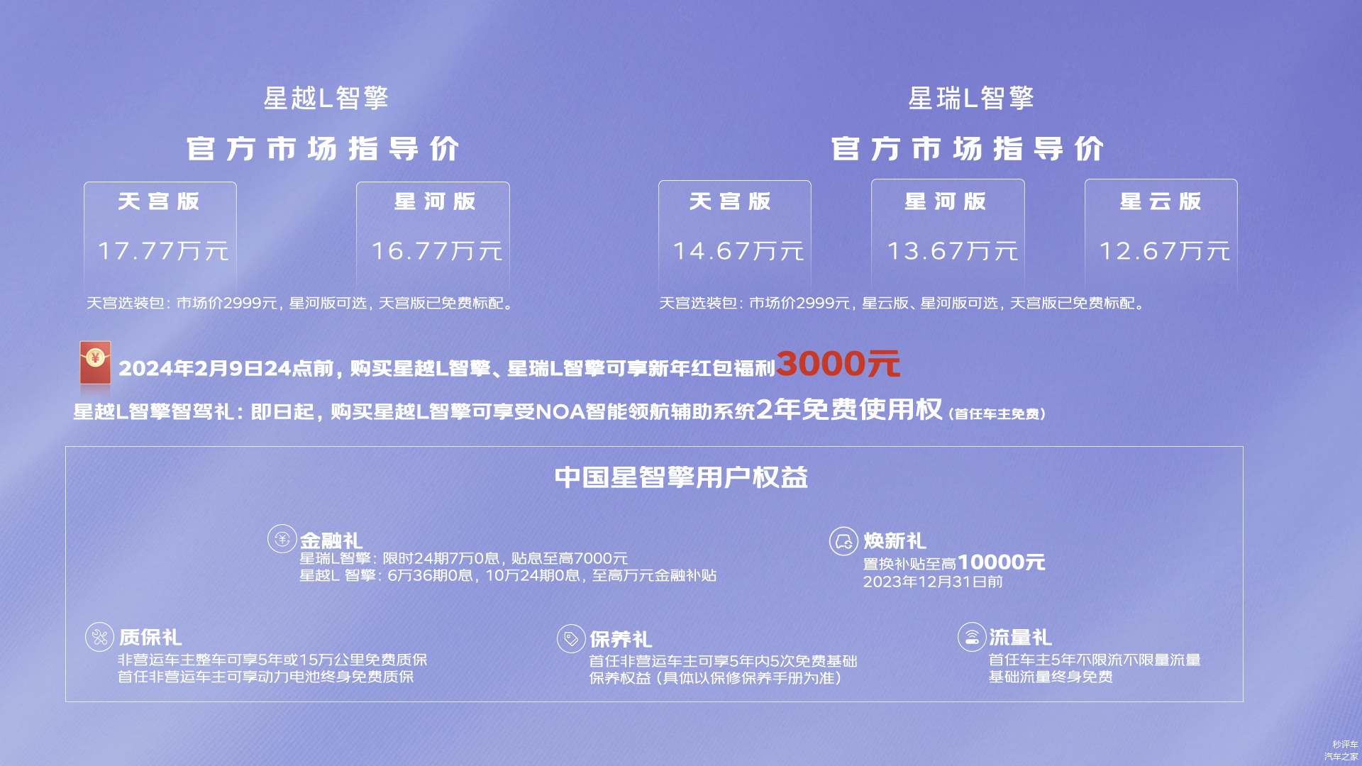 12月3日,吉利“中国星·文旅中国探索计划”河南站于郑州开启,中国星携手河南卫视创新打造一场融合中国文化与现代科技、舞蹈艺术与汽车工业于一体的“鸿鹄志·中国文化科技奇妙夜暨中国星智能双擎上市发布会”。在发布会上,中国星智擎双旗舰正式上市,星瑞L智擎推出星云版、星河版和天宫版三个版型,官方指导价为12.67万元—14.67万元; 星越L智擎(图片 | 参数 | 询价)推出星河版和天宫版两个版型,官方指导价为16.77万元—17.77万元。同时,在2024年2月9日24点前,购买中国星智擎车型,即可享受上市购车新年红包福利3000元;新年红包补贴后,星瑞L智擎限时新年红包价为12.37万元—14.37万元,星越L智擎限时新年红包价为16.47万元—17.47万元。