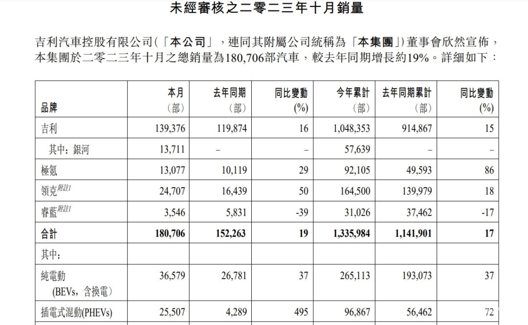 在吉利不久前发布的港交所文件中,公司今年前11个月的销量累计达到153.6万辆,较去年同期增长19%;其中新能源汽车的销量为36.2万辆,而去年同期这个数字为30万辆(其中还包括今年已经停产的油电混动)。