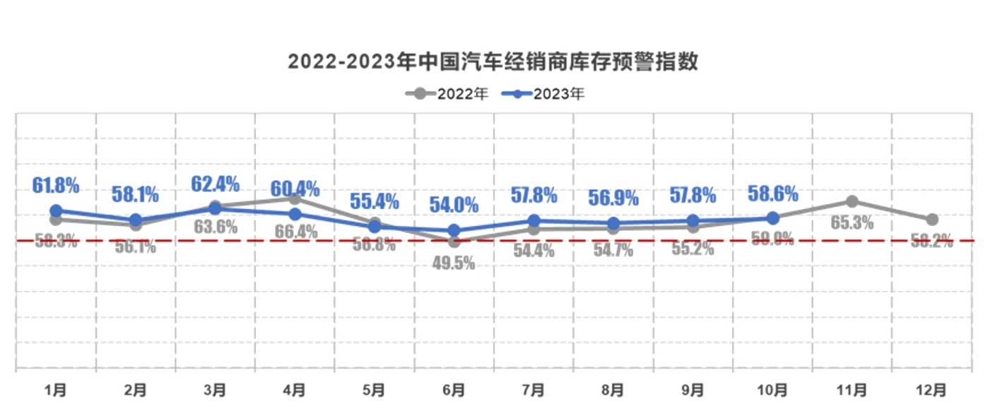 根据中国汽车经销商库存预警指数调查”(VIA)显示,2023年10月的库存预警指数为58.6%,预警指数仍位于荣枯线之上,经营状况恢复不及预期。也就是说,即使在金九银十的销售旺季,库存量依然高于正常水平,经销商的整体经营情况也没有得到太多好转。