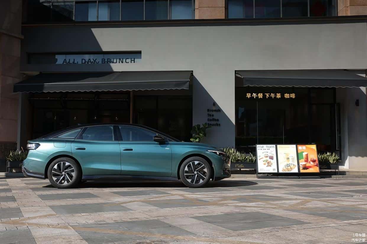 新车的侧面,是笔者个人认为ID.7 VIZZION最好看的角度。首先ID.7 VIZZION的车长达到了4956mm,在此基础上它还使用了短前悬和长后悬的设计,再配合上掀背式设计,这使得整车的轮廓与线条呈现出更为流畅与修长的视觉效果,同时这样的设计,也能够在一定程度上兼顾车内的纵向空间表现。
