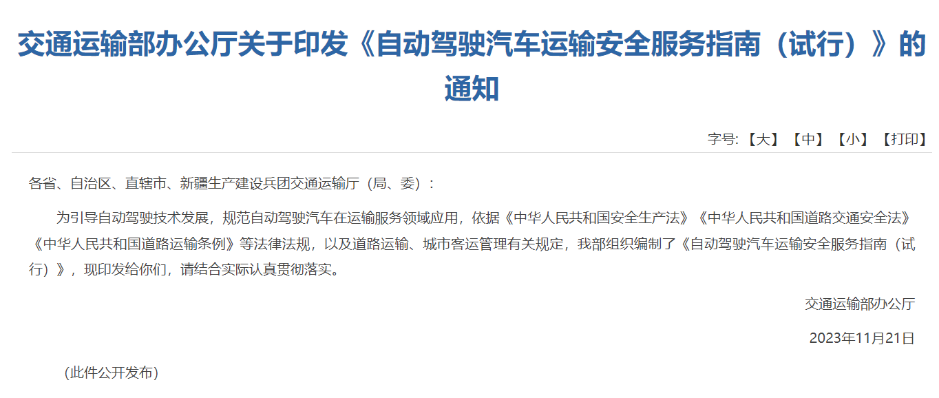 近日,中国交通运输部官网发布了《自动驾驶汽车运输安全服务指南(试行)》,进一步明确了自动驾驶汽车的适用范围,包括有条件的自动驾驶汽车、高度自动驾驶汽车以及完全自动驾驶汽车,为自动驾驶汽车的商业化落地提供了明确的标准和规范。