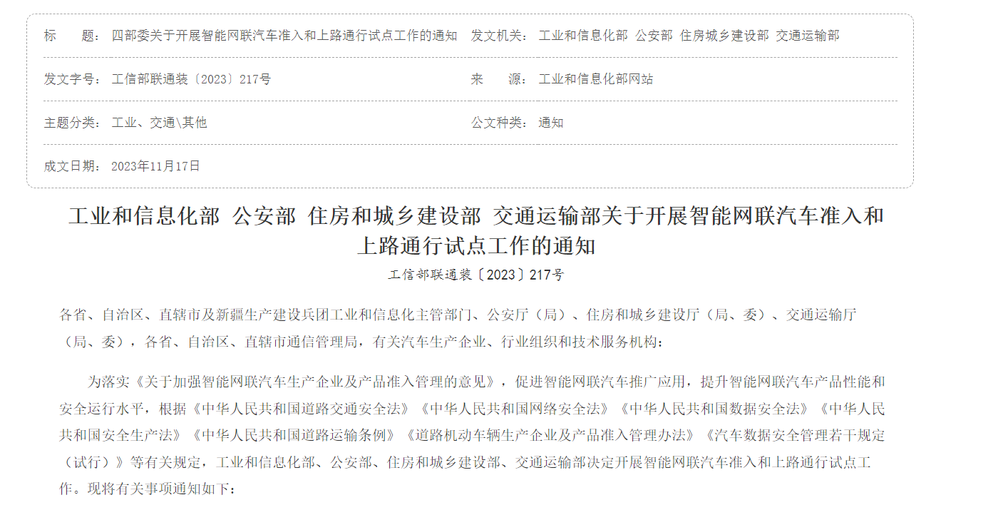 今年以来,中国政府在自动驾驶领域采取了一系列积极的政策措施。北京、上海等多个城市已经开展了商用车自动驾驶试点工作。11月17日,工业和信息化部、公安部、住房和城乡建设部、交通运输部等部门联合发布了《关于开展智能网联汽车准入和上路通行试点工作的通知》,标志着中国正式启动了智能网联汽车的商业化运行。