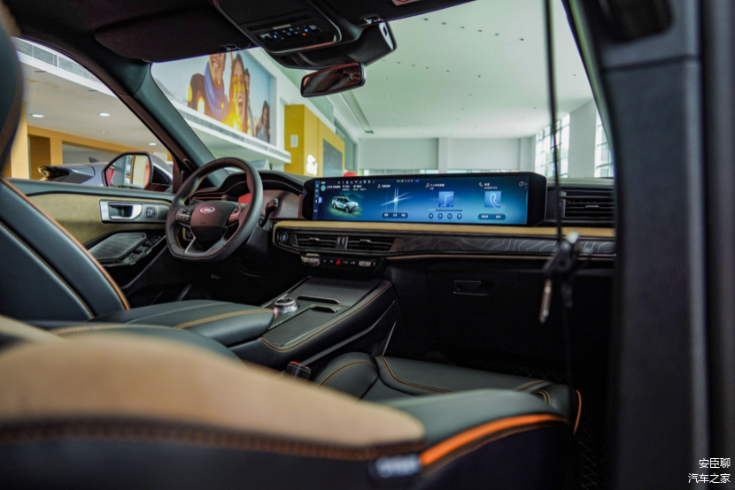 在内饰整体的设计上,昆仑巅峰版依旧是我们熟悉的探险者,全新一代车型的这套设计很明显是福特最新的家族化风格展现,很多线条设计都和昆仑山脉的线条吻合,这个是非常用心的。特别是这块一体式连屏,提升科技感的同时,高级的氛围也得到了展现,并且在清晰度、流畅度和功能丰富度方面都跟上了主流的表现。