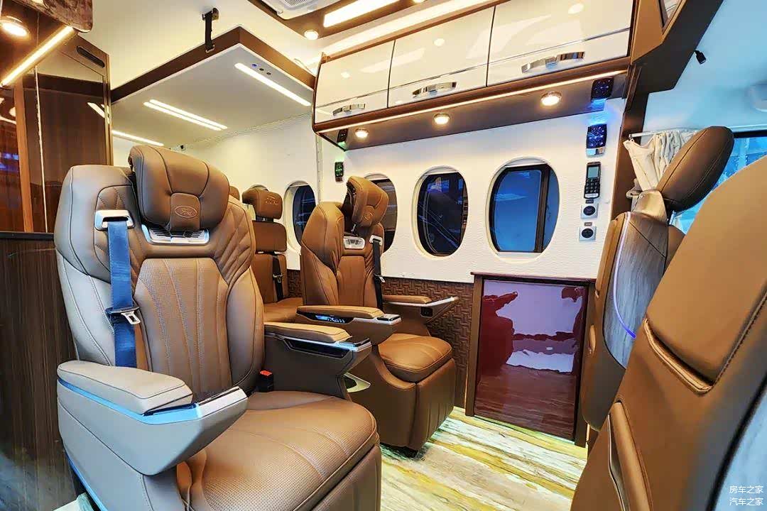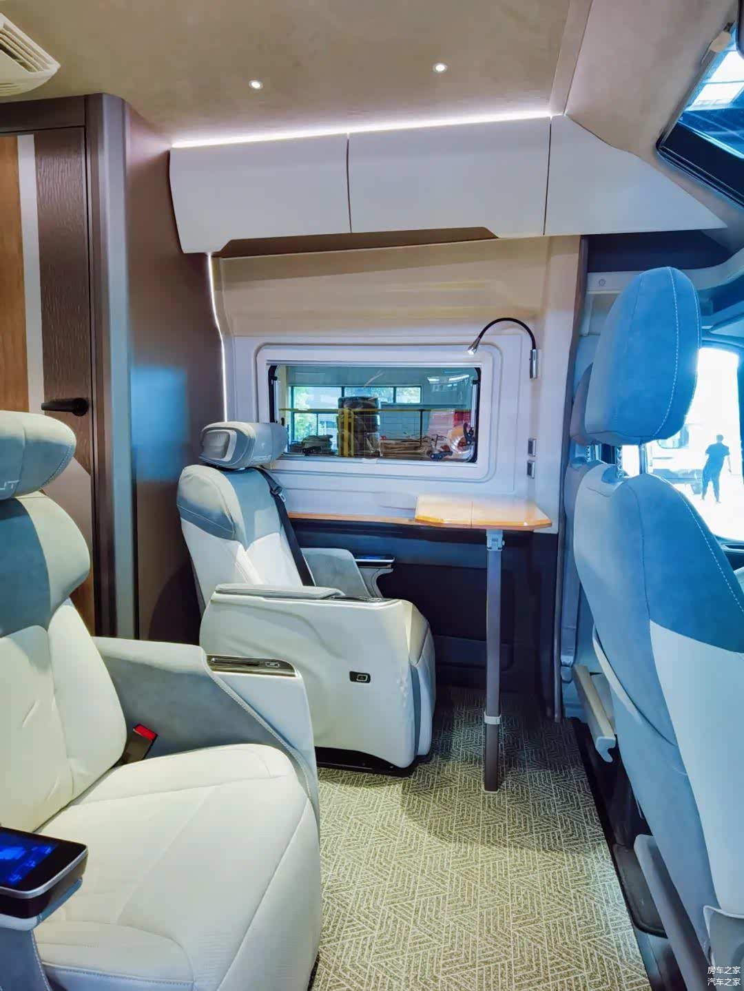 另外,如果您对商务出行有需求,卫航还有基于同样 全顺T8(图片 | 参数 | 询价)底盘改装的一款商旅型房车,名字叫“V363公务舱”房车(如上图双拼色外观图片所示),里面的装饰和居家不同,更侧重于商务的豪华和精致感。