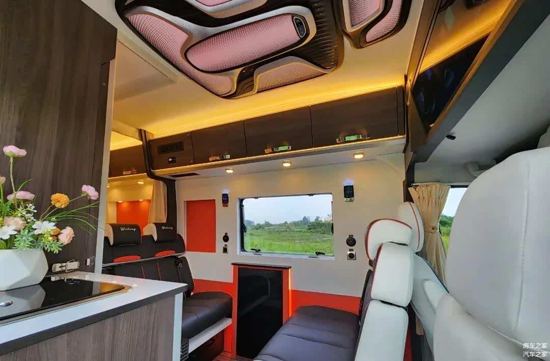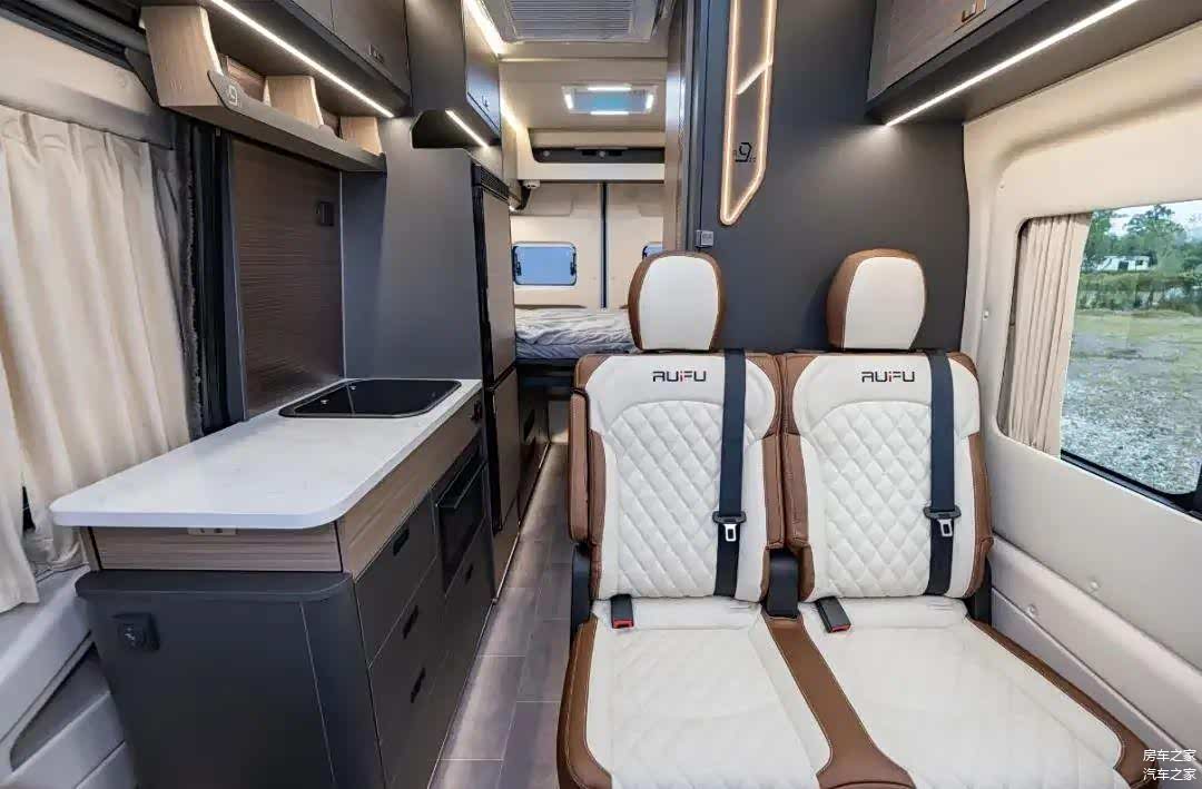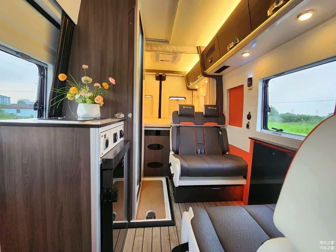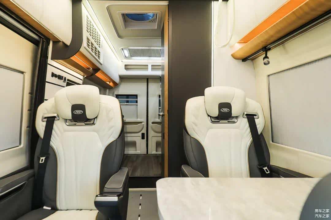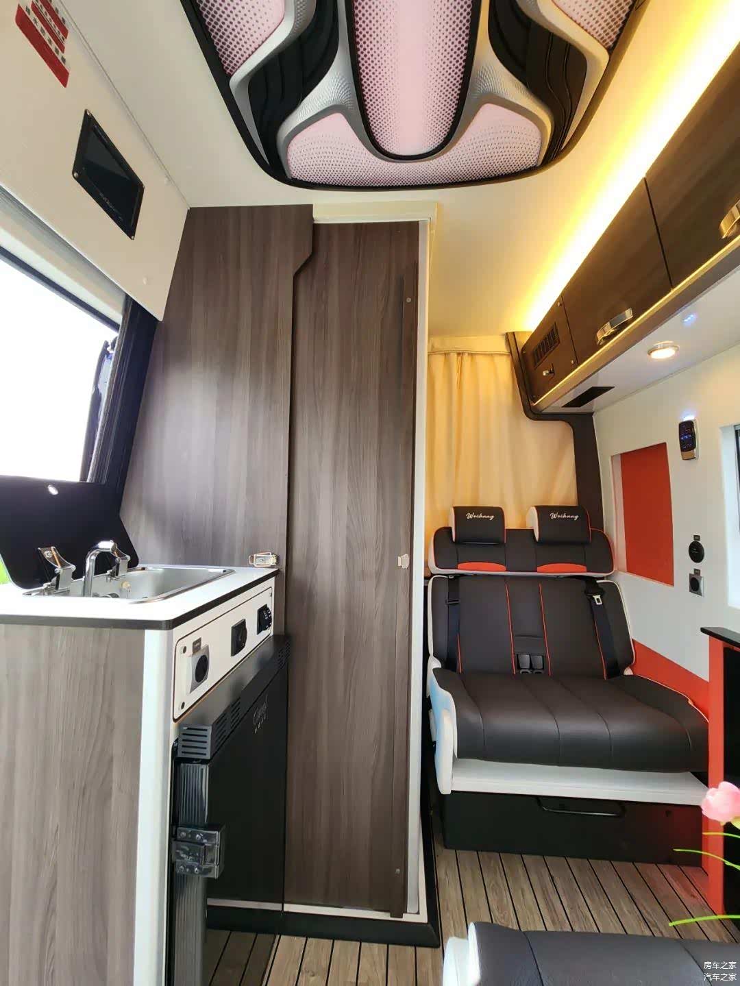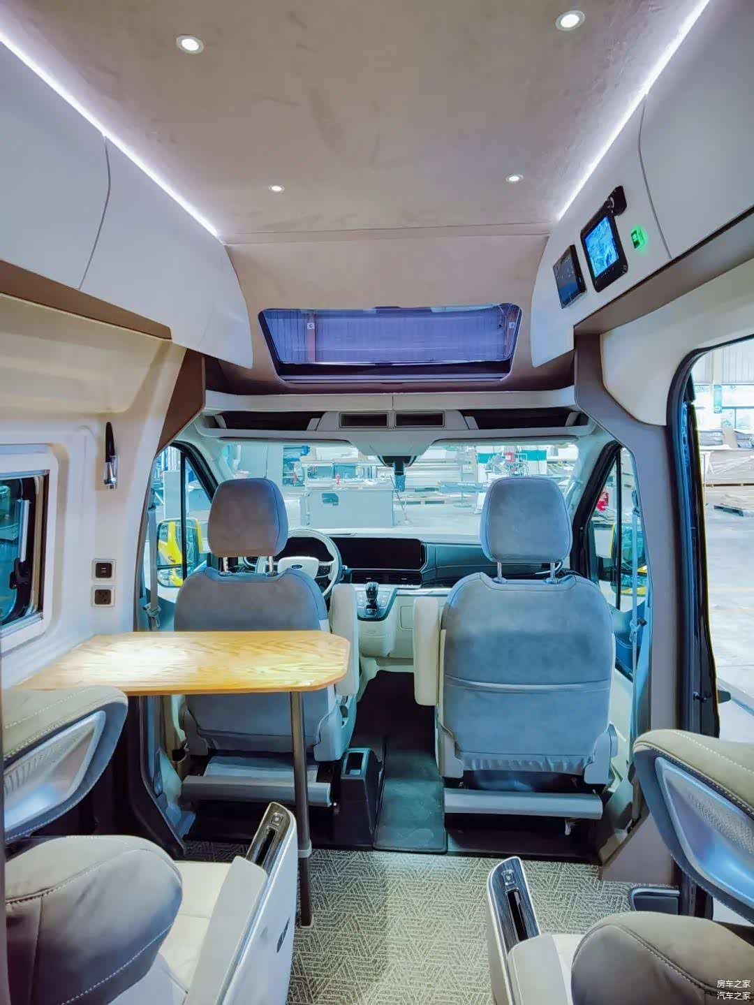 车内的布局比较常规,也是前置独立航空座椅,中置厨房和卫生间,车尾是一款横置的双人床位(2000×1350(mm))。不过这款车的内饰氛围偏向于低沉的设计,总体来说灯光系统不算特别的明快,可能是有意为之的设计。车内大量使用了吸塑开模件,规整程度可见一斑。